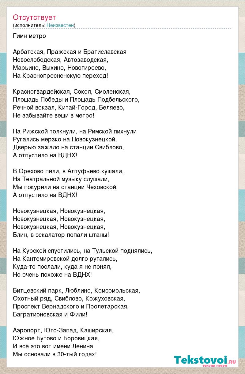 Гимн метро Арбатская, Пражская и Братиславская Новослободская, Автозаводская, Марьино, Выхино, Новогиреево, На Краснопресненскую переход! Красногвардейская, Сокол, Смоленская, Площадь Победы и Площадь Подбельского, Речной вокзал, Китай-Город, Беляево, Не забывайте вещи в метро! На Рижской толкнули, на Римской пихнули Ругались мерзко на Новокузнецкой, Дверью зажало на станции Свиблово, А отпустило на ВДНХ! В Орехово пили, в Алтуфьево кушали, На Театральной музыку слушали, Мы покурили на станции Чеховской, А отпустило на ВДНХ! Новокузнецкая, Новокузнецкая, Новокузнецкая, Новокузнецкая, Новокузнецкая, Новокузнецкая, Блин, в эскалатор попали штаны! На Курской спустились, на Тульской поднялись, На Кантемировской долго ругались, Куда-то послали, куда я не понял, Но очень похоже на ВДНХ! Битцевский парк, Люблино, Комсомольская, Охотный ряд, Свиблово, Кожуховская, Проспект Вернадского и Пролетарская, Багратионовская и Фили! Аэропорт, Юго-Запад, Каширская, Южное Бутово и Боровицкая, И всё это вот имени Ленина Мы основали в 30-тый годах!