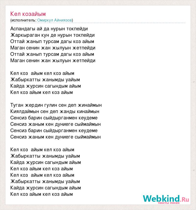 Аспандагы ай да нурын токпейди Жаркыраган кун де нурын токпейди Оттай жанып турсам дагы коз айым Маган сенин жан жылуын жетпейди Оттай жанып турсам дагы коз айым Маган сенин жан жылуын жетпейди Кел коз айым кел коз айым Жабыркатты жанымды уайым Кайда журсин сагындым айым Кел коз айым кел коз айым Туган жердин гулин сен деп жинаймын Киялдаймын сен деп жанды кинаймын Сенсиз барин сыйдырганмен кеудеме Сенсиз жаным кен дуниеге сыймаймын Сенсиз барин сыйдырганмен кеудеме Сенсиз жаным кен дуниеге сыймаймын Кел коз айым кел коз айым Жабыркатты жанымды уайым Кайда журсин сагындым айым Кел коз айым кел коз айым Кел коз айым кел коз айым Жабыркатты жанымды уайым Кайда журсин сагындым айым Кел коз айым кел коз айым