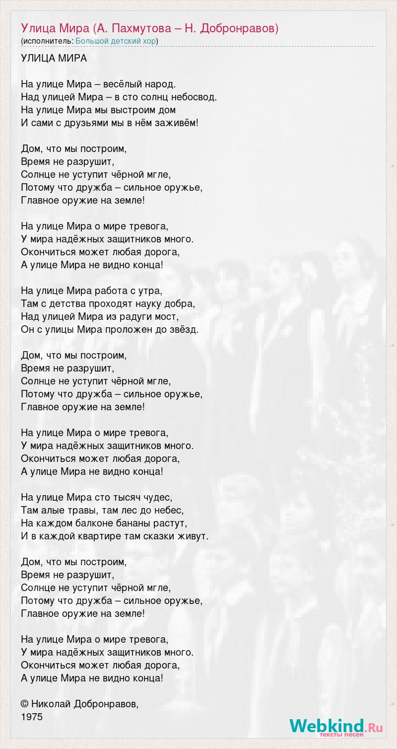УЛИЦА МИРА На улице Мира – весёлый народ. Над улицей Мира – в сто солнц небосвод. На улице Мира мы выстроим дом И сами с друзьями мы в нём заживём! Дом, что мы построим, Время не разрушит, Солнце не уступит чёрной мгле, Потому что дружба – сильное оружье, Главное оружие на земле! На улице Мира о мире тревога, У мира надёжных защитников много. Окончиться может любая дорога, А улице Мира не видно конца! На улице Мира работа с утра, Там с детства проходят науку добра, Над улицей Мира из радуги мост, Он с улицы Мира проложен до звёзд. Дом, что мы построим, Время не разрушит, Солнце не уступит чёрной мгле, Потому что дружба – сильное оружье, Главное оружие на земле! На улице Мира о мире тревога, У мира надёжных защитников много. Окончиться может любая дорога, А улице Мира не видно конца! На улице Мира сто тысяч чудес, Там алые травы, там лес до небес, На каждом балконе бананы растут, И в каждой квартире там сказки живут. Дом, что мы построим, Время не разрушит, Солнце не уступит чёрной мгле, Потому что дружба – сильное оружье, Главное оружие на земле! На улице Мира о мире тревога, У мира надёжных защитников много. Окончиться может любая дорога, А улице Мира не видно конца! © Николай Добронравов, 1975