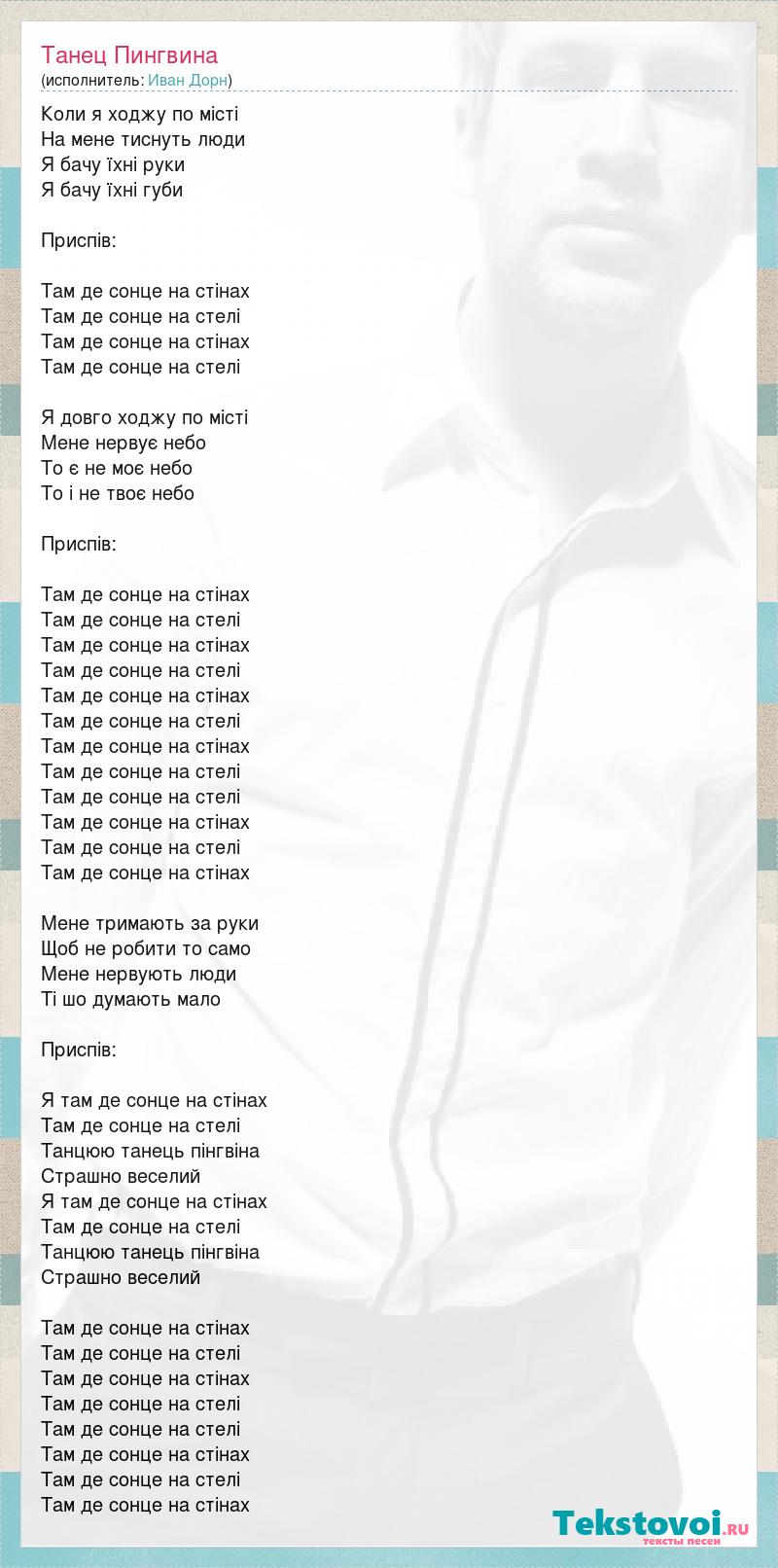 Коли я ходжу по місті На мене тиснуть люди Я бачу їхні руки Я бачу їхні губи Приспів: Там де сонце на стінах Там де сонце на стелі Там де сонце на стінах Там де сонце на стелі Я довго ходжу по місті Мене нервує небо То є не моє небо То і не твоє небо Приспів: Там де сонце на стінах Там де сонце на стелі Там де сонце на стінах Там де сонце на стелі Там де сонце на стінах Там де сонце на стелі Там де сонце на стінах Там де сонце на стелі Там де сонце на стелі Там де сонце на стінах Там де сонце на стелі Там де сонце на стінах Мене тримають за руки Щоб не робити то само Мене нервують люди Тi шо думають мало Приспів: Я там де сонце на стінах Там де сонце на стелі Танцюю танець пінгвіна Страшно веселий Я там де сонце на стінах Там де сонце на стелі Танцюю танець пінгвіна Страшно веселий Там де сонце на стінах Там де сонце на стелі Там де сонце на стінах Там де сонце на стелі Там де сонце на стелі Там де сонце на стінах Там де сонце на стелі Там де сонце на стінах