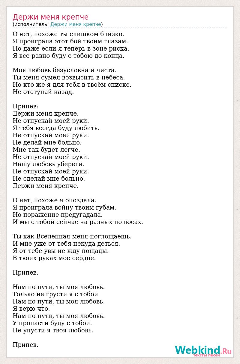 О нет, похоже ты слишком близко. Я проиграла этот бой твоим глазам. Но даже если я теперь в зоне риска. Я все равно буду с тобою до конца. Моя любовь безусловна и чиста. Ты меня сумел возвысить в небеса. Но кто же я для тебя в твоём списке. Не отступай назад. Припев: Держи меня крепче. Не отпускай моей руки. Я тебя всегда буду любить. Не отпускай моей руки. Не делай мне больно. Мне так будет легче. Не отпускай моей руки. Нашу любовь убереги. Не отпускай моей руки. Не сделай мне больно. Держи меня крепче. О нет, похоже я опоздала. Я проиграла войну твоим губам. Но поражение предугадала. И мы с тобой сейчас на разных полюсах. Ты как Вселенная меня поглощаешь. И мне уже от тебя некуда деться. Я от тебе увы не жду пощады. В твоих руках мое сердце. Припев. Нам по пути, ты моя любовь. Только не грусти я с тобой Нам по пути, ты моя любовь. Я верю что. Нам по пути, ты моя любовь. У пропасти буду с тобой. Не упусти я твоя любовь. Припев.