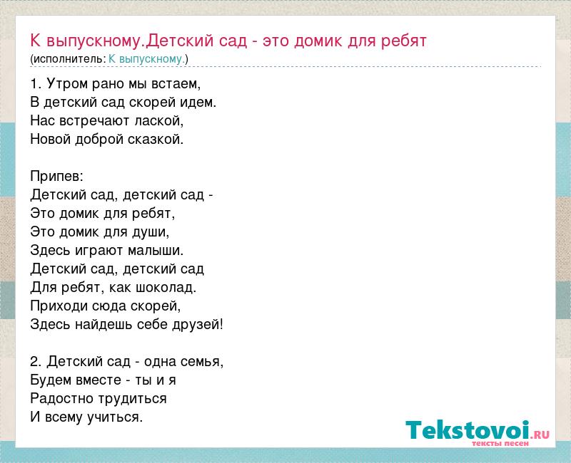 1. Утром рано мы встаем, В детский сад скорей идем. Нас встречают лаской, Новой доброй сказкой. Припев: Детский сад, детский сад - Это домик для ребят, Это домик для души, Здесь играют малыши. Детский сад, детский сад Для ребят, как шоколад. Приходи сюда скорей, Здесь найдешь себе друзей! 2. Детский сад - одна семья, Будем вместе - ты и я Радостно трудиться И всему учиться.