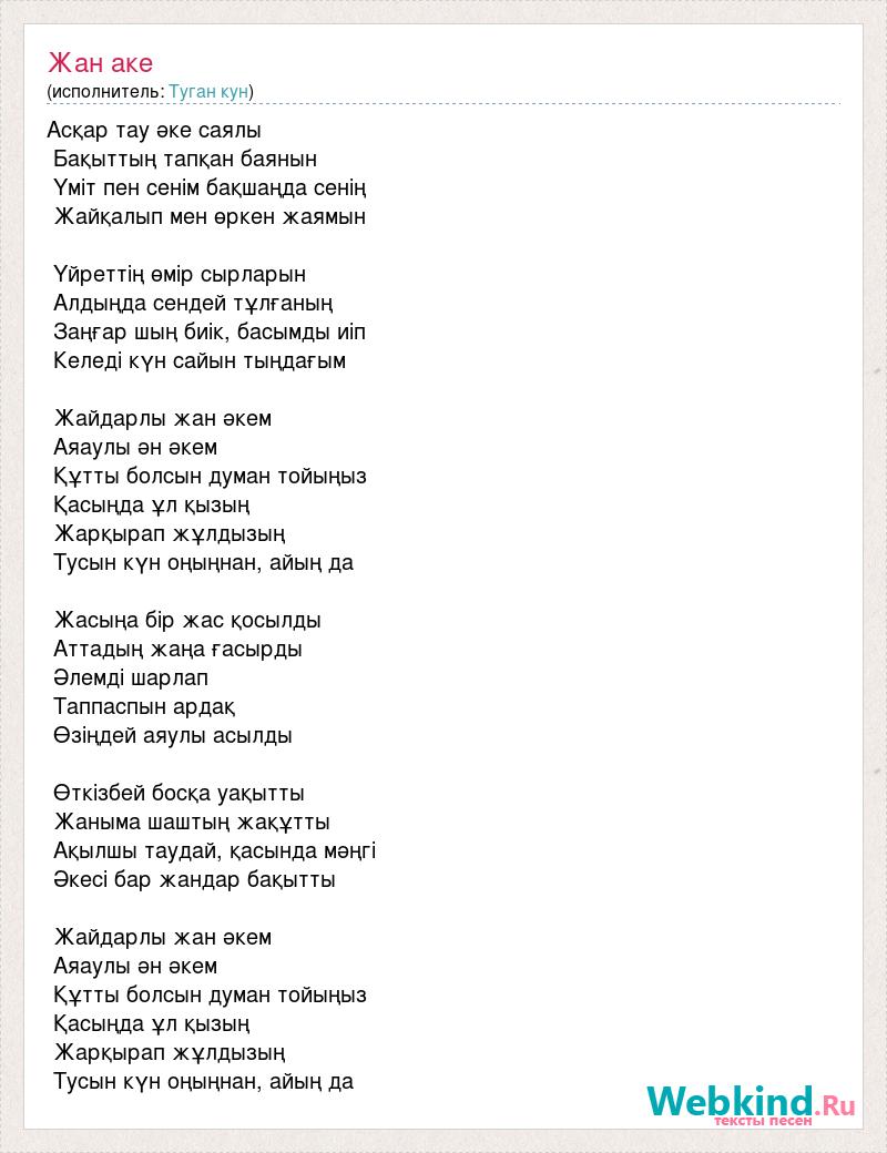 Асқар тау әке саялы Бақыттың тапқан баянын Үміт пен сенім бақшаңда сенің Жайқалып мен өркен жаямын Үйреттің өмір сырларын Алдыңда сендей тұлғаның Заңғар шың биік, басымды иіп Келеді күн сайын тыңдағым Жайдарлы жан әкем Аяаулы ән әкем Құтты болсын думан тойыңыз Қасыңда ұл қызың Жарқырап жұлдызың Тусын күн оңыңнан, айың да Жасыңа бір жас қосылды Аттадың жаңа ғасырды Әлемді шарлап Таппаспын ардақ Өзіңдей аяулы асылды Өткізбей босқа уақытты Жаныма шаштың жақұтты Ақылшы таудай, қасында мәңгі Әкесі бар жандар бақытты Жайдарлы жан әкем Аяаулы ән әкем Құтты болсын думан тойыңыз Қасыңда ұл қызың Жарқырап жұлдызың Тусын күн оңыңнан, айың да