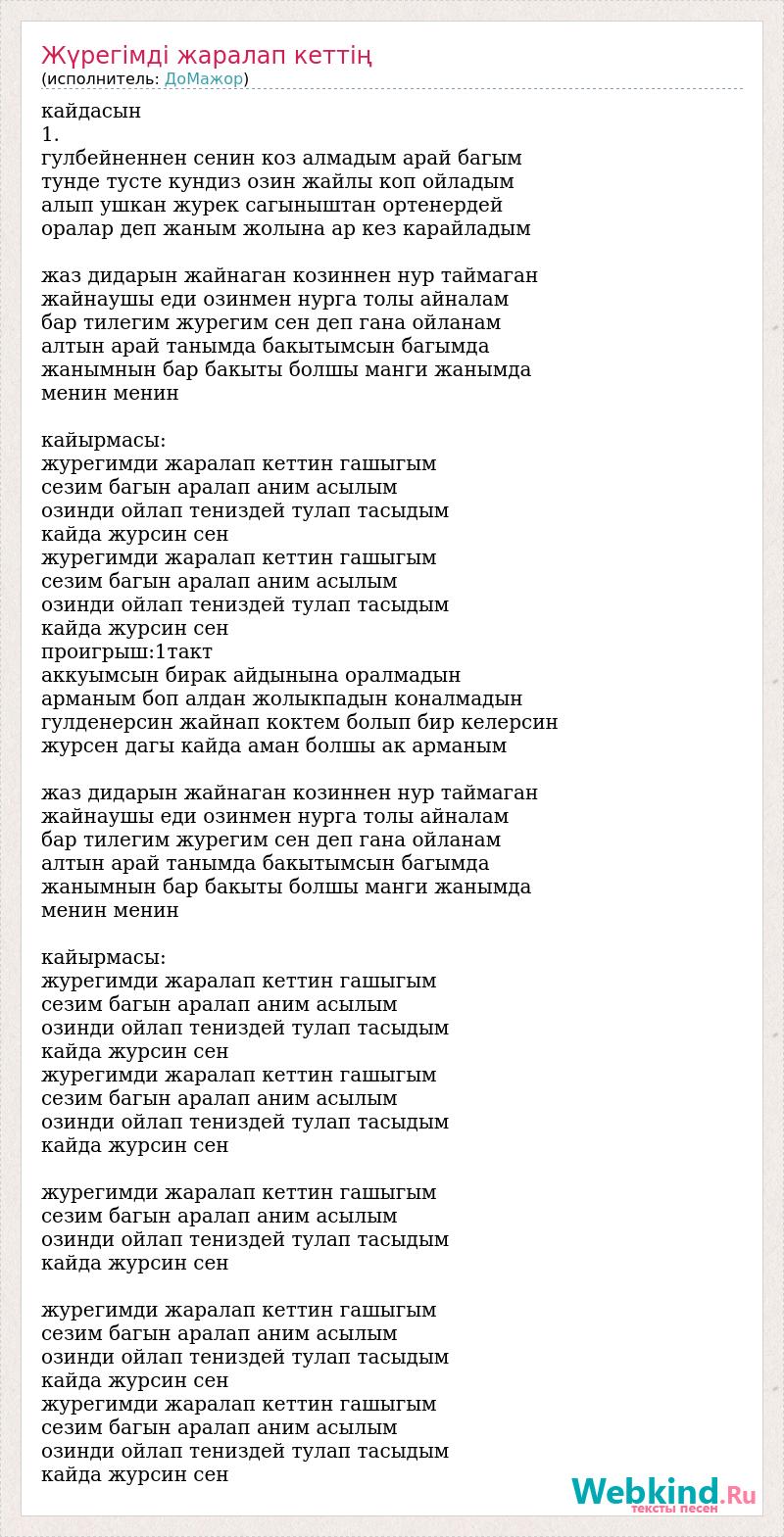 кайдасын 1. гулбейненнен сенин коз алмадым арай багым тунде тусте кундиз озин жайлы коп ойладым алып ушкан журек сагыныштан ортенердей оралар деп жаным жолына ар кез карайладым жаз дидарын жайнаган козиннен нур таймаган жайнаушы еди озинмен нурга толы айналам бар тилегим журегим сен деп гана ойланам алтын арай танымда бакытымсын багымда жанымнын бар бакыты болшы манги жанымда менин менин кайырмасы: журегимди жаралап кеттин гашыгым сезим багын аралап аним асылым озинди ойлап тениздей тулап тасыдым кайда журсин сен журегимди жаралап кеттин гашыгым сезим багын аралап аним асылым озинди ойлап тениздей тулап тасыдым кайда журсин сен проигрыш:1такт аккуымсын бирак айдынына оралмадын арманым боп алдан жолыкпадын коналмадын гулденерсин жайнап коктем болып бир келерсин журсен дагы кайда аман болшы ак арманым жаз дидарын жайнаган козиннен нур таймаган жайнаушы еди озинмен нурга толы айналам бар тилегим журегим сен деп гана ойланам алтын арай танымда бакытымсын багымда жанымнын бар бакыты болшы манги жанымда менин менин кайырмасы: журегимди жаралап кеттин гашыгым сезим багын аралап аним асылым озинди ойлап тениздей тулап тасыдым кайда журсин сен журегимди жаралап кеттин гашыгым сезим багын аралап аним асылым озинди ойлап тениздей тулап тасыдым кайда журсин сен журегимди жаралап кеттин гашыгым сезим багын аралап аним асылым озинди ойлап тениздей тулап тасыдым кайда журсин сен журегимди жаралап кеттин гашыгым сезим багын аралап аним асылым озинди ойлап тениздей тулап тасыдым кайда журсин сен журегимди жаралап кеттин гашыгым сезим багын аралап аним асылым озинди ойлап тениздей тулап тасыдым кайда журсин сен