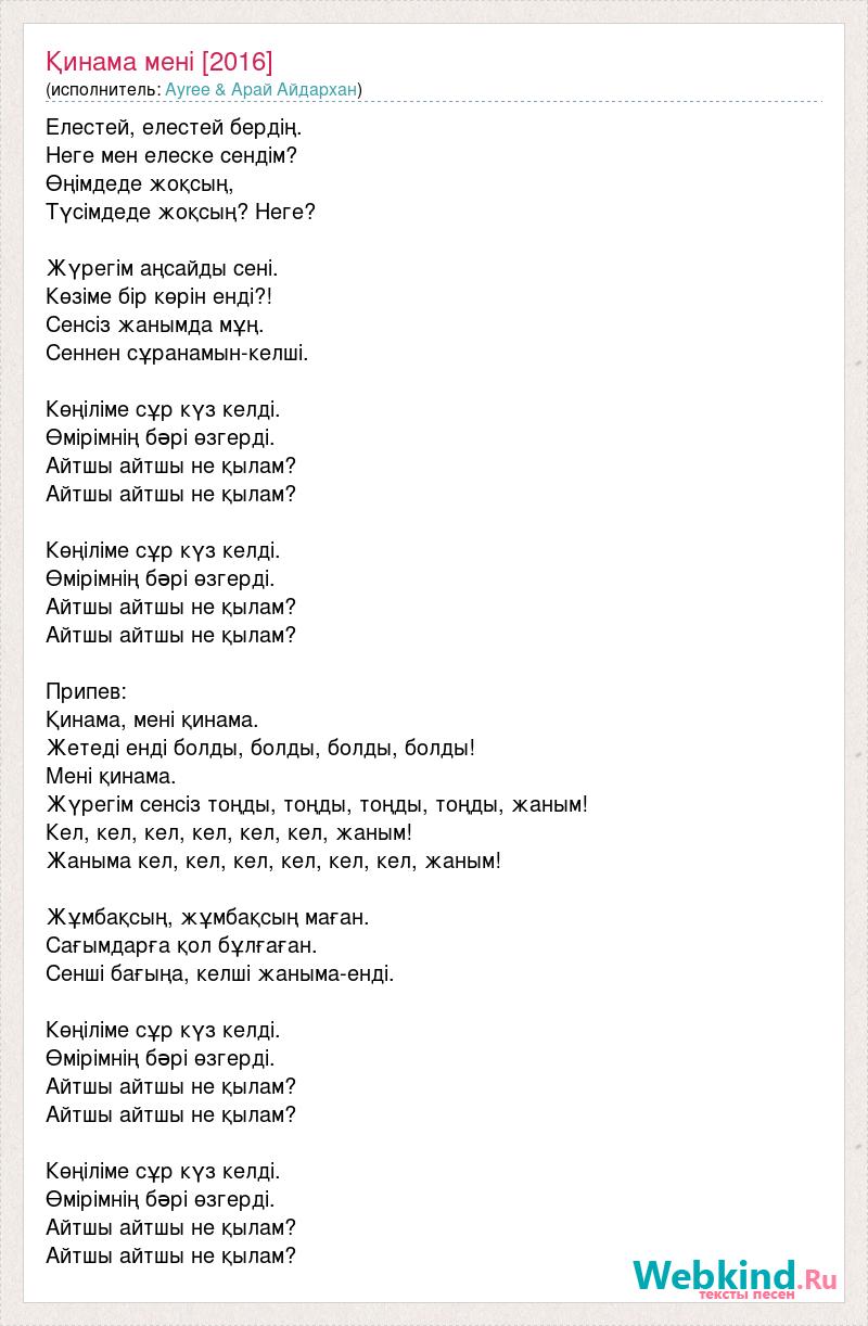 Елестей, елестей бердің. Неге мен елеске сендім? Өңімдеде жоқсың, Түсімдеде жоқсың? Неге? Жүрегім аңсайды сені. Көзіме бір көрін енді?! Сенсіз жанымда мұң. Сеннен сұранамын-келші. Көңіліме сұр күз келді. Өмірімнің бəрі өзгерді. Айтшы айтшы не қылам? Айтшы айтшы не қылам? Көңіліме сұр күз келді. Өмірімнің бəрі өзгерді. Айтшы айтшы не қылам? Айтшы айтшы не қылам? Припев: Қинама, мені қинама. Жетеді енді болды, болды, болды, болды! Мені қинама. Жүрегім сенсіз тоңды, тоңды, тоңды, тоңды, жаным! Кел, кел, кел, кел, кел, кел, жаным! Жаныма кел, кел, кел, кел, кел, кел, жаным! Жұмбақсың, жұмбақсың маған. Сағымдарға қол бұлғаған. Сенші бағыңа, келші жаныма-енді. Көңіліме сұр күз келді. Өмірімнің бəрі өзгерді. Айтшы айтшы не қылам? Айтшы айтшы не қылам? Көңіліме сұр күз келді. Өмірімнің бəрі өзгерді. Айтшы айтшы не қылам? Айтшы айтшы не қылам?
