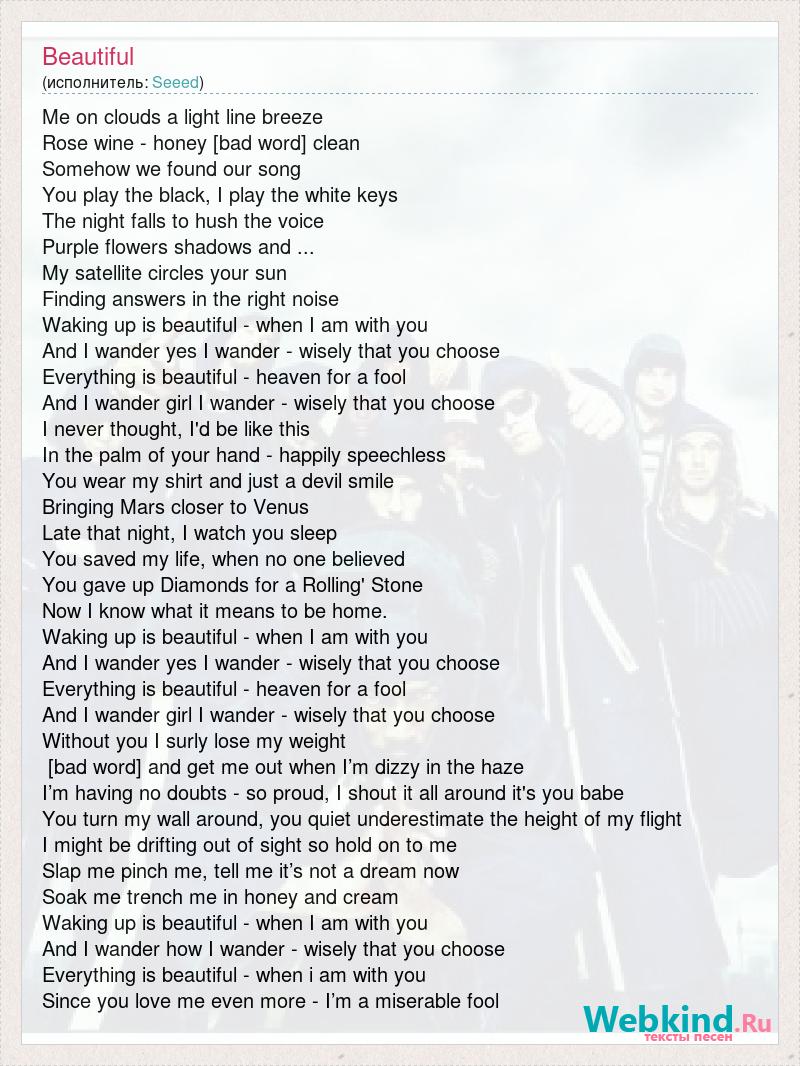 Me on clouds a light line breeze Rose wine - honey [bad word] clean Somehow we found our song You play the black, I play the white keys The night falls to hush the voice Purple flowers shadows and ... My satellite circles your sun Finding answers in the right noise Waking up is beautiful - when I am with you And I wander yes I wander - wisely that you choose Everything is beautiful - heaven for a fool And I wander girl I wander - wisely that you choose I never thought, I'd be like this In the palm of your hand - happily speechless You wear my shirt and just a devil smile Bringing Mars closer to Venus Late that night, I watch you sleep You saved my life, when no one believed You gave up Diamonds for a Rolling' Stone Now I know what it means to be home. Waking up is beautiful - when I am with you And I wander yes I wander - wisely that you choose Everything is beautiful - heaven for a fool And I wander girl I wander - wisely that you choose Without you I surly lose my weight [bad word] and get me out when I’m dizzy in the haze I’m having no doubts - so proud, I shout it all around it's you babe You turn my wall around, you quiet underestimate the height of my flight I might be drifting out of sight so hold on to me Slap me pinch me, tell me it’s not a dream now Soak me trench me in honey and cream Waking up is beautiful - when I am with you And I wander how I wander - wisely that you choose Everything is beautiful - when i am with you Since you love me even more - I’m a miserable fool