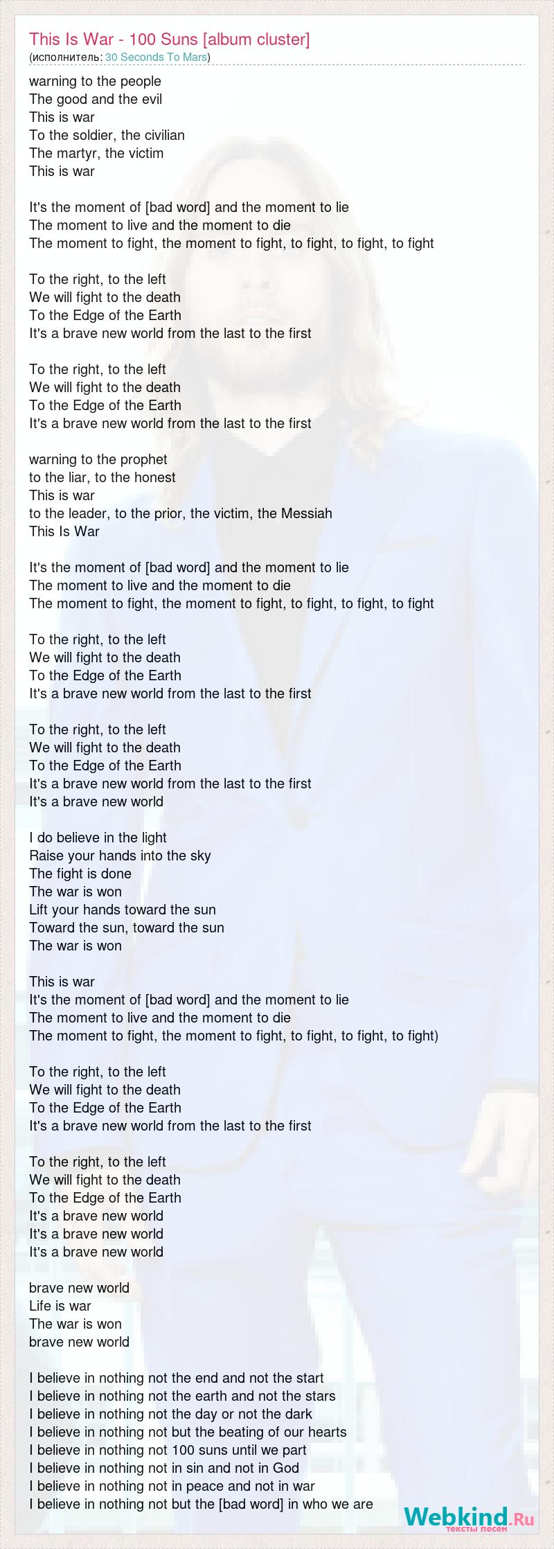 warning to the people The good and the evil This is war To the soldier, the civilian The martyr, the victim This is war It's the moment of [bad word] and the moment to lie The moment to live and the moment to die The moment to fight, the moment to fight, to fight, to fight, to fight To the right, to the left We will fight to the death To the Edge of the Earth It's a brave new world from the last to the first To the right, to the left We will fight to the death To the Edge of the Earth It's a brave new world from the last to the first warning to the prophet to the liar, to the honest This is war to the leader, to the prior, the victim, the Messiah This Is War It's the moment of [bad word] and the moment to lie The moment to live and the moment to die The moment to fight, the moment to fight, to fight, to fight, to fight To the right, to the left We will fight to the death To the Edge of the Earth It's a brave new world from the last to the first To the right, to the left We will fight to the death To the Edge of the Earth It's a brave new world from the last to the first It's a brave new world I do believe in the light Raise your hands into the sky The fight is done The war is won Lift your hands toward the sun Toward the sun, toward the sun The war is won This is war It's the moment of [bad word] and the moment to lie The moment to live and the moment to die The moment to fight, the moment to fight, to fight, to fight, to fight) To the right, to the left We will fight to the death To the Edge of the Earth It's a brave new world from the last to the first To the right, to the left We will fight to the death To the Edge of the Earth It's a brave new world It's a brave new world It's a brave new world brave new world Life is war The war is won brave new world I believe in nothing not the end and not the start I believe in nothing not the earth and not the stars I believe in nothing not the day or not the dark I believe in nothing not but the beating of our hearts I believe in nothing not 100 suns until we part I believe in nothing not in sin and not in God I believe in nothing not in peace and not in war I believe in nothing not but the [bad word] in who we are
