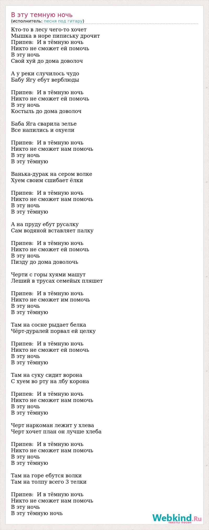 Кто-то в лесу чего-то хочет Мышка в норе пипиську дрочит Припев: И в тёмную ночь Никто не сможет ей помочь В эту ночь Свой хуй до дома доволоч А у реки случилось чудо Бабу Ягу ебут верблюды Припев: И в тёмную ночь Никто не сможет ей помочь В эту ночь Костыль до дома доволоч Баба Яга сварила зелье Все напились и охуели Припев: И в тёмную ночь Никто не сможет нам помочь В эту ночь В эту тёмную Ванька-дурак на сером волке Хуем своим сшибает ёлки Припев: И в тёмную ночь Никто не сможет нам помочь В эту ночь В эту тёмную А на пруду ебут русалку Сам водяной вставляет палку Припев: И в тёмную ночь Никто не сможет ей помочь В эту ночь Пизду до дома доволочь Черти с горы хуями машут Леший в трусах семейых пляшет Припев: И в тёмную ночь Никто не сможет им помочь В эту ночь В эту тёмную Там на сосне рыдает белка Чёрт-дуралей порвал ей целку Припев: И в тёмную ночь Никто не сможет ей помочь В эту ночь В эту тёмную Там на суку сидит ворона С хуем во рту на лбу корона Припев: И в тёмную ночь Никто не сможет нам помочь В эту ночь В эту тёмную Черт наркоман лежит у хлева Черт хочет план он лучше хлеба Припев: И в тёмную ночь Никто не сможет нам помочь В эту ночь В эту тёмную Там на горе ебутся волки Там на толпу всего 3 телки Припев: И в тёмную ночь Никто не сможет нам помочь В эту ночь В эту тёмную ночь