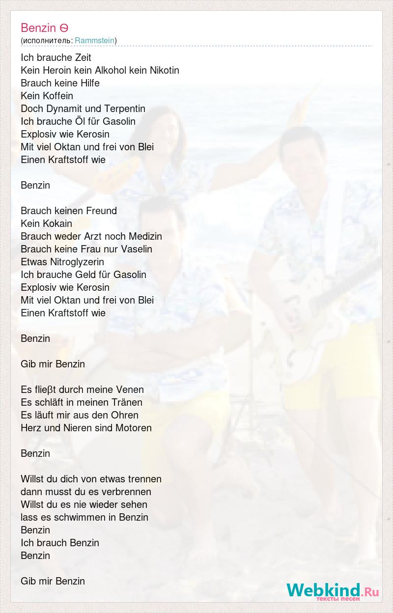 Ich brauche Zeit Kein Heroin kein Alkohol kein Nikotin Brauch keine Hilfe Kein Koffein Doch Dynamit und Terpentin Ich brauche Öl für Gasolin Explosiv wie Kerosin Mit viel Oktan und frei von Blei Einen Kraftstoff wie Benzin Brauch keinen Freund Kein Kokain Brauch weder Arzt noch Medizin Brauch keine Frau nur Vaselin Etwas Nitroglyzerin Ich brauche Geld für Gasolin Explosiv wie Kerosin Mit viel Oktan und frei von Blei Einen Kraftstoff wie Benzin Gib mir Benzin Es flieβt durch meine Venen Es schläft in meinen Tränen Es läuft mir aus den Ohren Herz und Nieren sind Motoren Benzin Willst du dich von etwas trennen dann musst du es verbrennen Willst du es nie wieder sehen lass es schwimmen in Benzin Benzin Ich brauch Benzin Benzin Gib mir Benzin