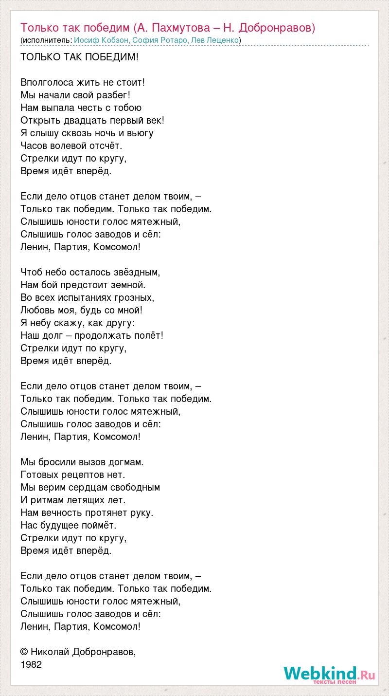 ТОЛЬКО ТАК ПОБЕДИМ! Вполголоса жить не стоит! Мы начали свой разбег! Нам выпала честь с тобою Открыть двадцать первый век! Я слышу сквозь ночь и вьюгу Часов волевой отсчёт. Стрелки идут по кругу, Время идёт вперёд. Если дело отцов станет делом твоим, – Только так победим. Только так победим. Слышишь юности голос мятежный, Слышишь голос заводов и сёл: Ленин, Партия, Комсомол! Чтоб небо осталось звёздным, Нам бой предстоит земной. Во всех испытаниях грозных, Любовь моя, будь со мной! Я небу скажу, как другу: Наш долг – продолжать полёт! Стрелки идут по кругу, Время идёт вперёд. Если дело отцов станет делом твоим, – Только так победим. Только так победим. Слышишь юности голос мятежный, Слышишь голос заводов и сёл: Ленин, Партия, Комсомол! Мы бросили вызов догмам. Готовых рецептов нет. Мы верим сердцам свободным И ритмам летящих лет. Нам вечность протянет руку. Нас будущее поймёт. Стрелки идут по кругу, Время идёт вперёд. Если дело отцов станет делом твоим, – Только так победим. Только так победим. Слышишь юности голос мятежный, Слышишь голос заводов и сёл: Ленин, Партия, Комсомол! © Николай Добронравов, 1982