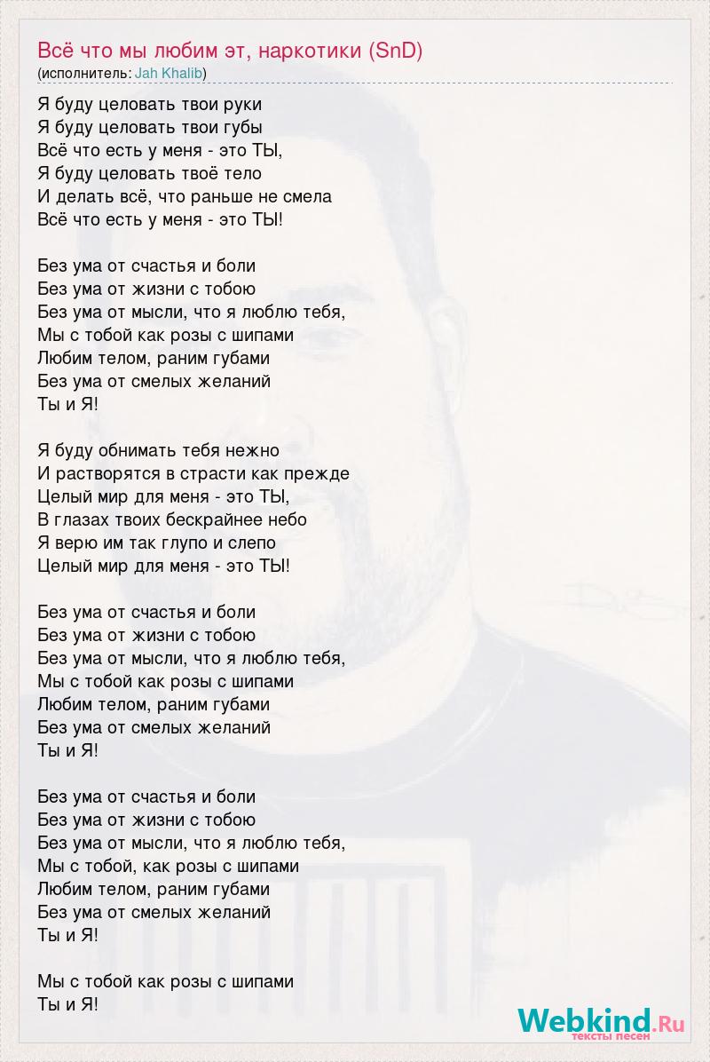 Я буду целовать твои руки Я буду целовать твои губы Всё что есть у меня - это ТЫ, Я буду целовать твоё тело И делать всё, что раньше не смела Всё что есть у меня - это ТЫ! Без ума от счастья и боли Без ума от жизни с тобою Без ума от мысли, что я люблю тебя, Мы с тобой как розы с шипами Любим телом, раним губами Без ума от смелых желаний Ты и Я! Я буду обнимать тебя нежно И растворятся в страсти как прежде Целый мир для меня - это ТЫ, В глазах твоих бескрайнее небо Я верю им так глупо и слепо Целый мир для меня - это ТЫ! Без ума от счастья и боли Без ума от жизни с тобою Без ума от мысли, что я люблю тебя, Мы с тобой как розы с шипами Любим телом, раним губами Без ума от смелых желаний Ты и Я! Без ума от счастья и боли Без ума от жизни с тобою Без ума от мысли, что я люблю тебя, Мы с тобой, как розы с шипами Любим телом, раним губами Без ума от смелых желаний Ты и Я! Мы с тобой как розы с шипами Ты и Я!