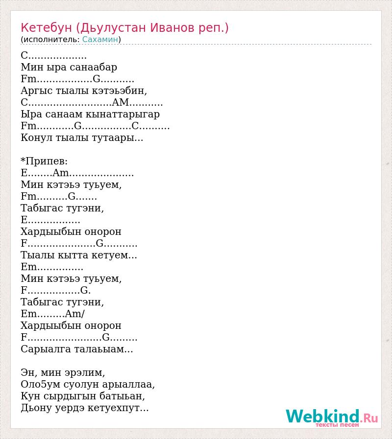 С................... Мин ыра санаабар Fm..................G........... Аргыс тыалы кэтэьэбин, C...........................AM........... Ыра санаам кынаттарыгар Fm............G................C.......... Конул тыалы тутаары... *Припев: E........Am..................... Мин кэтэьэ туьуем, Fm..........G....... Табыгас тугэни, E................. Хардыыбын онорон F......................G........... Тыалы кытта кетуем... Em............... Мин кэтэьэ туьуем, F.................G. Табыгас тугэни, Em.........Am/ Хардыыбын онорон F........................G......... Сарыалга талаьыам... Эн, мин эрэлим, Оло5ум суолун арыаллаа, Кун сырдыгын батыьан, Дьону уердэ кетуехпут...