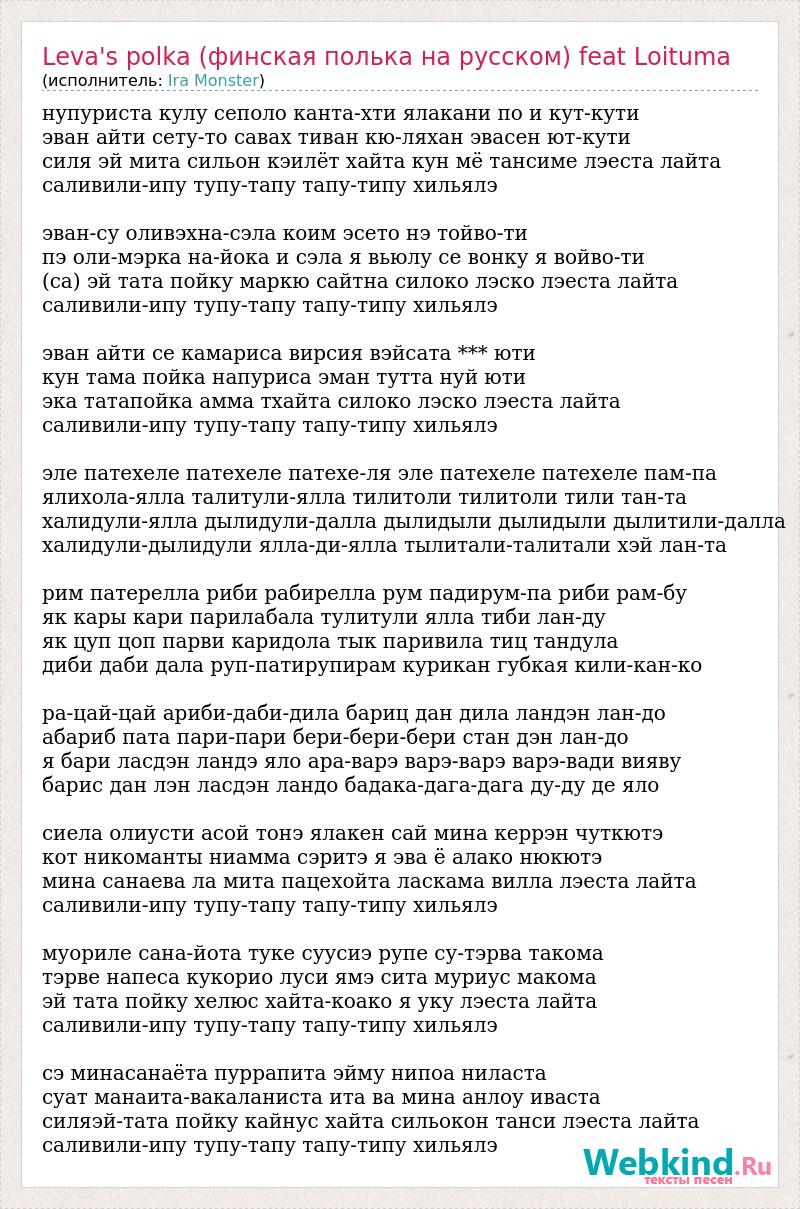 нупуриста кулу сеполо канта-хти ялакани по и кут-кути эван айти сету-то савах тиван кю-ляхан эвасен ют-кути силя эй мита сильон кэилёт хайта кун мё тансиме лэеста лайта саливили-ипу тупу-тапу тапу-типу хильялэ эван-су оливэхна-сэла коим эсето нэ тойво-ти пэ оли-мэрка на-йока и сэла я вьюлу се вонку я войво-ти (са) эй тата пойку маркю сайтна силоко лэско лэеста лайта саливили-ипу тупу-тапу тапу-типу хильялэ эван айти се камариса вирсия вэйсата *** юти кун тама пойка напуриса эман тутта нуй юти эка татапойка амма тхайта силоко лэско лэеста лайта саливили-ипу тупу-тапу тапу-типу хильялэ эле патехеле патехеле патехе-ля эле патехеле патехеле пам-па ялихола-ялла талитули-ялла тилитоли тилитоли тили тан-та халидули-ялла дылидули-далла дылидыли дылидыли дылитили-далла халидули-дылидули ялла-ди-ялла тылитали-талитали хэй лан-та рим патерелла риби рабирелла рум падирум-па риби рам-бу як кары кари парилабала тулитули ялла тиби лан-ду як цуп цоп парви каридола тык паривила тиц тандула диби даби дала руп-патирупирам курикан губкая кили-кан-ко ра-цай-цай ариби-даби-дила бариц дан дила ландэн лан-до абариб пата пари-пари бери-бери-бери стан дэн лан-до я бари ласдэн ландэ яло ара-варэ варэ-варэ варэ-вади вияву барис дан лэн ласдэн ландо бадака-дага-дага ду-ду де яло сиела олиусти асой тонэ ялакен сай мина керрэн чуткютэ кот никоманты ниамма сэритэ я эва ё алако нюкютэ мина санаева ла мита пацехойта ласкама вилла лэеста лайта саливили-ипу тупу-тапу тапу-типу хильялэ муориле сана-йота туке суусиэ рупе су-тэрва такома тэрве напеса кукорио луси ямэ сита муриус макома эй тата пойку хелюс хайта-коако я уку лэеста лайта саливили-ипу тупу-тапу тапу-типу хильялэ сэ минасанаёта пуррапита эйму нипоа ниласта суат манаита-вакаланиста ита ва мина анлоу иваста силяэй-тата пойку кайнус хайта сильокон танси лэеста лайта саливили-ипу тупу-тапу тапу-типу хильялэ
