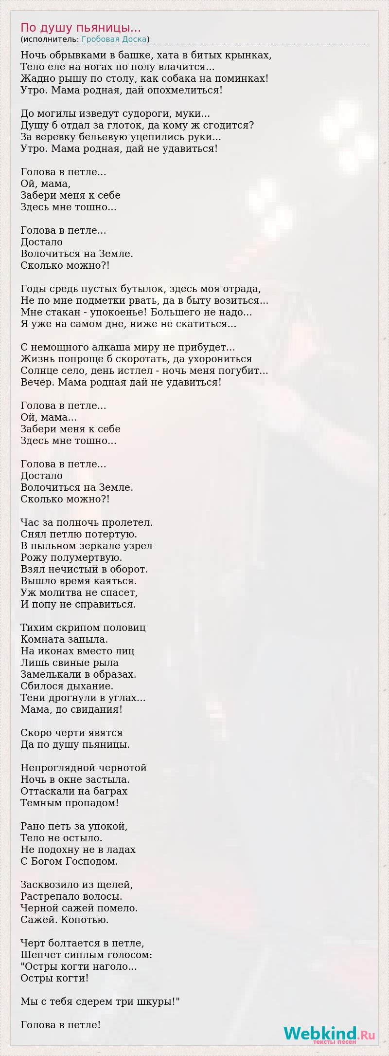 Ночь обрывками в башке, хата в битых крынках, Тело еле на ногах по полу влачится... Жадно рыщу по столу, как собака на поминках! Утро. Мама родная, дай опохмелиться! До могилы изведут судороги, муки... Душу б отдал за глоток, да кому ж сгодится? За веревку бельевую уцепились руки... Утро. Мама родная, дай не удавиться! Голова в петле... Ой, мама, Забери меня к себе Здесь мне тошно... Голова в петле... Достало Волочиться на Земле. Сколько можно?! Годы средь пустых бутылок, здесь моя отрада, Не по мне подметки рвать, да в быту возиться... Мне стакан - упокоенье! Большего не надо... Я уже на самом дне, ниже не скатиться... С немощного алкаша миру не прибудет... Жизнь попроще б скоротать, да ухорониться Солнце село, день истлел - ночь меня погубит... Вечер. Мама родная дай не удавиться! Голова в петле... Ой, мама... Забери меня к себе Здесь мне тошно... Голова в петле... Достало Волочиться на Земле. Сколько можно?! Час за полночь пролетел. Снял петлю потертую. В пыльном зеркале узрел Рожу полумертвую. Взял нечистый в оборот. Вышло время каяться. Уж молитва не спасет, И попу не справиться. Тихим скрипом половиц Комната заныла. На иконах вместо лиц Лишь свиные рыла Замелькали в образах. Сбилося дыхание. Тени дрогнули в углах... Мама, до свидания! Скоро черти явятся Да по душу пьяницы. Непроглядной чернотой Ночь в окне застыла. Оттаскали на баграх Темным пропадом! Рано петь за упокой, Тело не остыло. Не подохну не в ладах С Богом Господом. Засквозило из щелей, Растрепало волосы. Черной сажей помело. Сажей. Копотью. Черт болтается в петле, Шепчет сиплым голосом: "Остры когти наголо... Остры когти! Мы с тебя сдерем три шкуры!" Голова в петле!