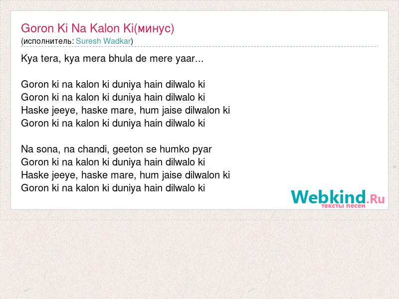 Kya tera, kya mera bhula de mere yaar... Goron ki na kalon ki duniya hain dilwalo ki Goron ki na kalon ki duniya hain dilwalo ki Haske jeeye, haske mare, hum jaise dilwalon ki Goron ki na kalon ki duniya hain dilwalo ki Na sona, na chandi, geeton se humko pyar Goron ki na kalon ki duniya hain dilwalo ki Haske jeeye, haske mare, hum jaise dilwalon ki Goron ki na kalon ki duniya hain dilwalo ki