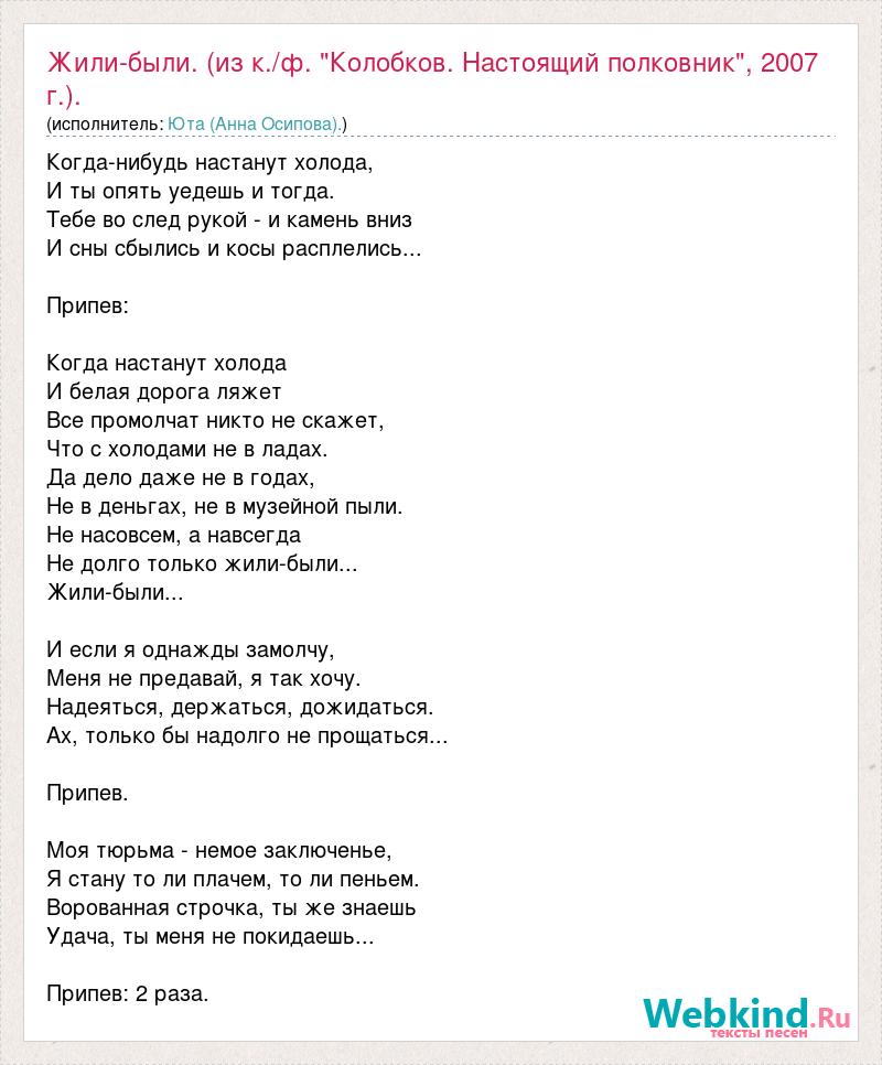 Главная→Исполнители→Юта (Анна Осипова).→Жили-были. (из к./ф. "Колобков. Настоящий полковник", 2007 г.).