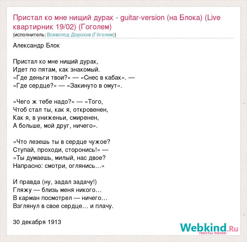 А как ты думаешь, о чем песня "Пристал ко мне нищий дурак - guitar-version (на Блока) (Live квартирник" ?