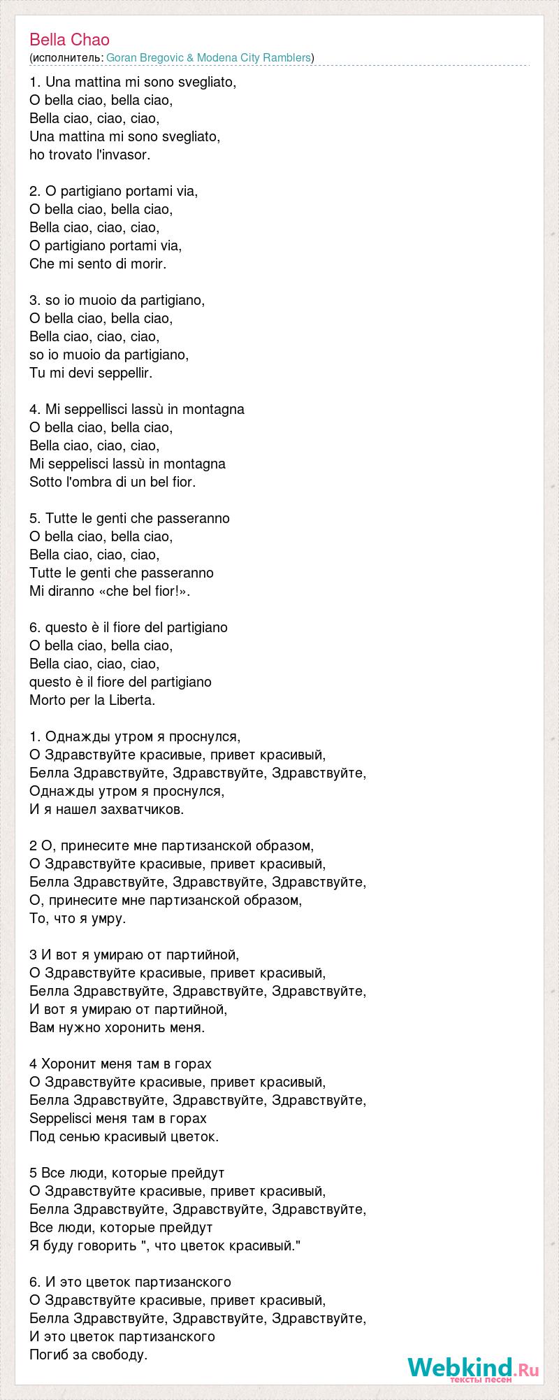 1. Una mattina mi sono svegliato, O bella ciao, bella ciao, Bella ciao, ciao, ciao, Una mattina mi sono svegliato, ho trovato l'invasor. 2. O partigiano portami via, O bella ciao, bella ciao, Bella ciao, ciao, ciao, O partigiano portami via, Che mi sento di morir. 3. so io muoio da partigiano, O bella ciao, bella ciao, Bella ciao, ciao, ciao, so io muoio da partigiano, Tu mi devi seppellir. 4. Mi seppellisci lassù in montagna O bella ciao, bella ciao, Bella ciao, ciao, ciao, Mi seppelisci lassù in montagna Sotto l'ombra di un bel fior. 5. Tutte le genti che passeranno O bella ciao, bella ciao, Bella ciao, ciao, ciao, Tutte le genti che passeranno Mi diranno «che bel fior!». 6. questo è il fiore del partigiano O bella ciao, bella ciao, Bella ciao, ciao, ciao, questo è il fiore del partigiano Morto per la Liberta. 1. Однажды утром я проснулся, O Здравствуйте красивые, привет красивый, Белла Здравствуйте, Здравствуйте, Здравствуйте, Однажды утром я проснулся, И я нашел захватчиков. 2 O, принесите мне партизанской образом, O Здравствуйте красивые, привет красивый, Белла Здравствуйте, Здравствуйте, Здравствуйте, O, принесите мне партизанской образом, То, что я умру. 3 И вот я умираю от партийной, O Здравствуйте красивые, привет красивый, Белла Здравствуйте, Здравствуйте, Здравствуйте, И вот я умираю от партийной, Вам нужно хоронить меня. 4 Хоронит меня там в горах O Здравствуйте красивые, привет красивый, Белла Здравствуйте, Здравствуйте, Здравствуйте, Seppelisci меня там в горах Под сенью красивый цветок. 5 Все люди, которые прейдут O Здравствуйте красивые, привет красивый, Белла Здравствуйте, Здравствуйте, Здравствуйте, Все люди, которые прейдут Я буду говорить ", что цветок красивый." 6. И это цветок партизанского O Здравствуйте красивые, привет красивый, Белла Здравствуйте, Здравствуйте, Здравствуйте, И это цветок партизанского Погиб за свободу.