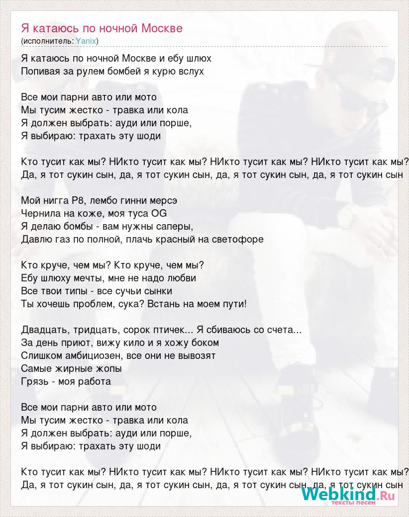 Я катаюсь по ночной Москве и ебу шлюх Попивая за рулем бомбей я курю вслух Все мои парни авто или мото Мы тусим жестко - травка или кола Я должен выбрать: ауди или порше, Я выбираю: трахать эту шоди Кто тусит как мы? НИкто тусит как мы? НИкто тусит как мы? НИкто тусит как мы? Да, я тот сукин сын, да, я тот сукин сын, да, я тот сукин сын, да, я тот сукин сын Мой нигга Р8, лембо гинни мерсэ Чернила на коже, моя туса OG Я делаю бомбы - вам нужны саперы, Давлю газ по полной, плачь красный на светофоре Кто круче, чем мы? Кто круче, чем мы? Ебу шлюху мечты, мне не надо любви Все твои типы - все сучьи сынки Ты хочешь проблем, сука? Встань на моем пути! Двадцать, тридцать, сорок птичек... Я сбиваюсь со счета... За день приют, вижу кило и я хожу боком Слишком амбициозен, все они не вывозят Самые жирные жопы Грязь - моя работа Все мои парни авто или мото Мы тусим жестко - травка или кола Я должен выбрать: ауди или порше, Я выбираю: трахать эту шоди Кто тусит как мы? НИкто тусит как мы? НИкто тусит как мы? НИкто тусит как мы? Да, я тот сукин сын, да, я тот сукин сын, да, я тот сукин сын, да, я тот сукин сын