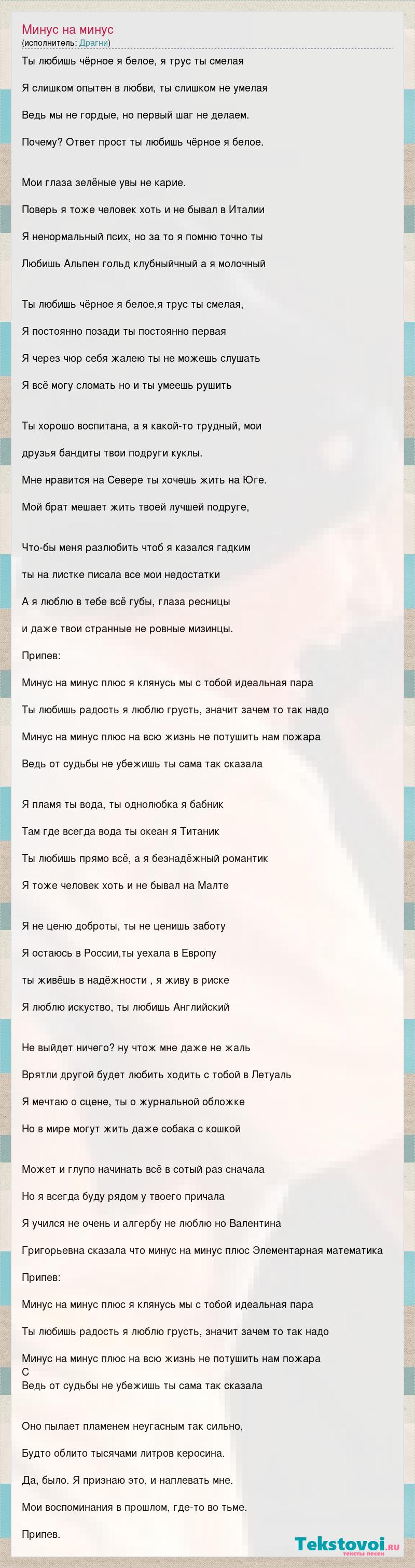 Ты любишь чёрное я белое, я трус ты смелая Я слишком опытен в любви, ты слишком не умелая Ведь мы не гордые, но первый шаг не делаем. Почему? Ответ прост ты любишь чёрное я белое. Мои глаза зелёные увы не карие. Поверь я тоже человек хоть и не бывал в Италии Я ненормальный псих, но за то я помню точно ты Любишь Альпен гольд клубныйчный а я молочный Ты любишь чёрное я белое,я трус ты смелая, Я постоянно позади ты постоянно первая Я через чюр себя жалею ты не можешь слушать Я всё могу сломать но и ты умеешь рушить Ты хорошо воспитана, а я какой-то трудный, мои друзья бандиты твои подруги куклы. Мне нравится на Севере ты хочешь жить на Юге. Мой брат мешает жить твоей лучшей подруге, Что-бы меня разлюбить чтоб я казался гадким ты на листке писала все мои недостатки А я люблю в тебе всё губы, глаза ресницы и даже твои странные не ровные мизинцы. Припев: Минус на минус плюс я клянусь мы с тобой идеальная пара Ты любишь радость я люблю грусть, значит зачем то так надо Минус на минус плюс на всю жизнь не потушить нам пожара Ведь от судьбы не убежишь ты сама так сказала Я пламя ты вода, ты однолюбка я бабник Там где всегда вода ты океан я Титаник Ты любишь прямо всё, а я безнадёжный романтик Я тоже человек хоть и не бывал на Малте Я не ценю доброты, ты не ценишь заботу Я остаюсь в России,ты уехала в Европу ты живёшь в надёжности , я живу в риске Я люблю искуство, ты любишь Английский Не выйдет ничего? ну чтож мне даже не жаль Врятли другой будет любить ходить с тобой в Летуаль Я мечтаю о сцене, ты о журнальной обложке Но в мире могут жить даже собака с кошкой Может и глупо начинать всё в сотый раз сначала Но я всегда буду рядом у твоего причала Я учился не очень и алгербу не люблю но Валентина Григорьевна сказала что минус на минус плюс Элементарная математика Припев: Минус на минус плюс я клянусь мы с тобой идеальная пара Ты любишь радость я люблю грусть, значит зачем то так надо Минус на минус плюс на всю жизнь не потушить нам пожара С Ведь от судьбы не убежишь ты сама так сказала Оно пылает пламенем неугасным так сильно, Будто облито тысячами литров керосина. Да, было. Я признаю это, и наплевать мне. Мои воспоминания в прошлом, где-то во тьме. Припев.