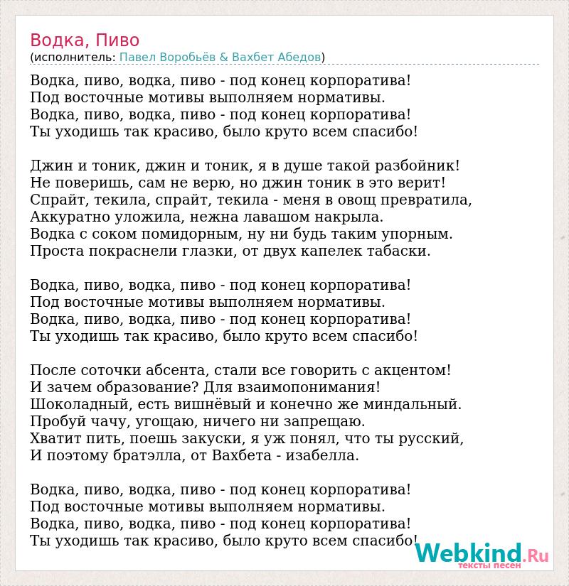 Водка, пиво, водка, пиво - под конец корпоратива! Под восточные мотивы выполняем нормативы. Водка, пиво, водка, пиво - под конец корпоратива! Ты уходишь так красиво, было круто всем спасибо! Джин и тоник, джин и тоник, я в душе такой разбойник! Не поверишь, сам не верю, но джин тоник в это верит! Спрайт, текила, спрайт, текила - меня в овощ превратила, Аккуратно уложила, нежна лавашом накрыла. Водка с соком помидорным, ну ни будь таким упорным. Проста покраснели глазки, от двух капелек табаски. Водка, пиво, водка, пиво - под конец корпоратива! Под восточные мотивы выполняем нормативы. Водка, пиво, водка, пиво - под конец корпоратива! Ты уходишь так красиво, было круто всем спасибо! После соточки абсента, стали все говорить с акцентом! И зачем образование? Для взаимопонимания! Шоколадный, есть вишнёвый и конечно же миндальный. Пробуй чачу, угощаю, ничего ни запрещаю. Хватит пить, поешь закуски, я уж понял, что ты русский, И поэтому братэлла, от Вахбета - изабелла. Водка, пиво, водка, пиво - под конец корпоратива! Под восточные мотивы выполняем нормативы. Водка, пиво, водка, пиво - под конец корпоратива! Ты уходишь так красиво, было круто всем спасибо!