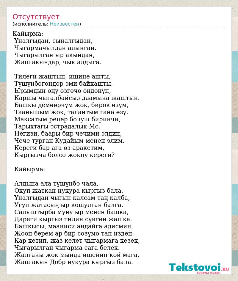 Кайырма: Үналгыдан, сыналгыдан, Чыгармачылдан алынган. Чыгарылган ыр акындан, Жаш акындар, чык алдыга. Тилеги жаштын, ишине ашты, Түшүнбөгөндөр эми байкашты. Ырымдын өңү өзгөчө өңдөнүп, Каршы чыгалбайсыз даамына жаштын. Башкы демөөрчүм жок, бирок өзүм, Таанышым жок, талантым гана өзү. Максатым репер болуш биринчи, Тарыхтагы эстрадалык Мс. Негизи, баары бир чечими элдин, Чече турган Кудайым менен элим. Кереги бар ага өз аракетим, Кыргызча болсо жокпу кереги? Кайырма: Алдына ала түшүнбө чала, Окуп жаткан нукура кыргыз бала. Үналгыдан чыгып калсам таң калба, Угуп жатасың ыр кошулган балга. Салыштырба муну ыр менен башка, Дареги кыргыз тилин сүйгөн жашка. Башкысы, мааниси андайга адисмин, Жооп берем ар бир сөзүмө тап издеп. Кар кетип, жаз келет чыгармага кезек, Чыгарылган чыгарма сага белек. Жалганы жок мында ишенип кой мага, Жаш акын Добр нукура кыргыз бала.