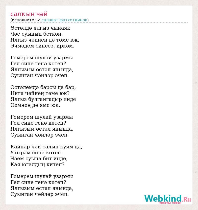 Өстәлдә ялгыз чынаяк Чәе суынып беткән. Ялгыз чәйнең дә тәме юк, Эчмәдем синсез, иркәм. Гомерем шулай узармы Гел сине генә көтеп? Ялгызым өстәл янында, Суынган чәйләр эчеп. Өстәлемдә барсы да бар, Нигә чәйнең тәме юк? Ялгыз булгангадыр инде Өемнең дә яме юк. Гомерем шулай узармы Гел сине генә көтеп? Ялгызым өстәл янында, Суынган чәйләр эчеп. Кайнар чәй салып куям да, Утырам сине көтеп. Чәем суына бит инде, Кая югалдың китеп? Гомерем шулай узармы Гел сине генә көтеп? Ялгызым өстәл янында, Суынган чәйләр эчеп.