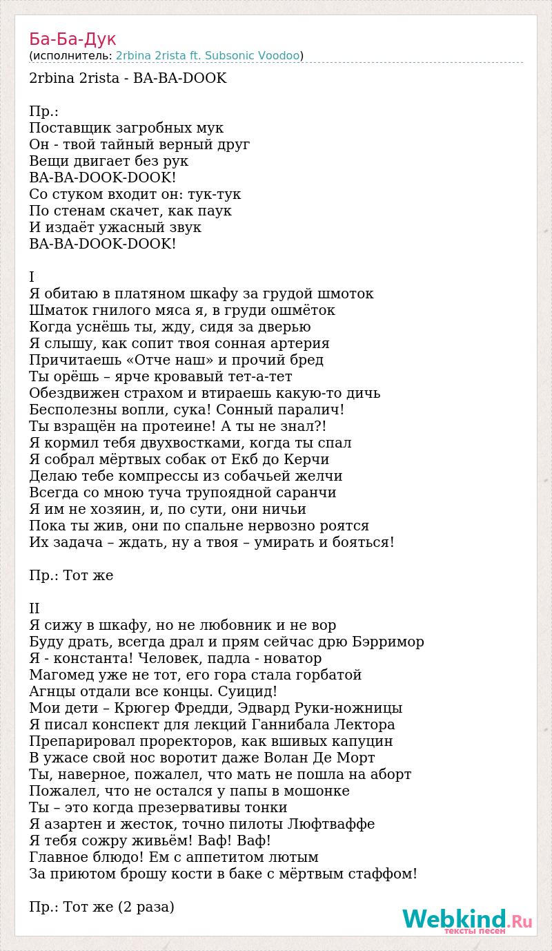 2rbina 2rista - BA-BA-DOOK Пр.: Поставщик загробных мук Он - твой тайный верный друг Вещи двигает без рук BA-BA-DOOK-DOOK! Со стуком входит он: тук-тук По стенам скачет, как паук И издаёт ужасный звук BA-BA-DOOK-DOOK! I Я обитаю в платяном шкафу за грудой шмоток Шматок гнилого мяса я, в груди ошмёток Когда уснёшь ты, жду, сидя за дверью Я слышу, как сопит твоя сонная артерия Причитаешь «Отче наш» и прочий бред Ты орёшь – ярче кровавый тет-а-тет Обездвижен страхом и втираешь какую-то дичь Бесполезны вопли, сука! Сонный паралич! Ты взращён на протеине! А ты не знал?! Я кормил тебя двухвостками, когда ты спал Я собрал мёртвых собак от Екб до Керчи Делаю тебе компрессы из собачьей желчи Всегда со мною туча трупоядной саранчи Я им не хозяин, и, по сути, они ничьи Пока ты жив, они по спальне нервозно роятся Их задача – ждать, ну а твоя – умирать и бояться! Пр.: Тот же II Я сижу в шкафу, но не любовник и не вор Буду драть, всегда драл и прям сейчас дрю Бэрримор Я - константа! Человек, падла - новатор Магомед уже не тот, его гора стала горбатой Агнцы отдали все концы. Суицид! Мои дети – Крюгер Фредди, Эдвард Руки-ножницы Я писал конспект для лекций Ганнибала Лектора Препарировал проректоров, как вшивых капуцин В ужасе свой нос воротит даже Волан Де Морт Ты, наверное, пожалел, что мать не пошла на аборт Пожалел, что не остался у папы в мошонке Ты – это когда презервативы тонки Я азартен и жесток, точно пилоты Люфтваффе Я тебя сожру живьём! Ваф! Ваф! Главное блюдо! Ем с аппетитом лютым За приютом брошу кости в баке с мёртвым стаффом! Пр.: Тот же (2 раза)
