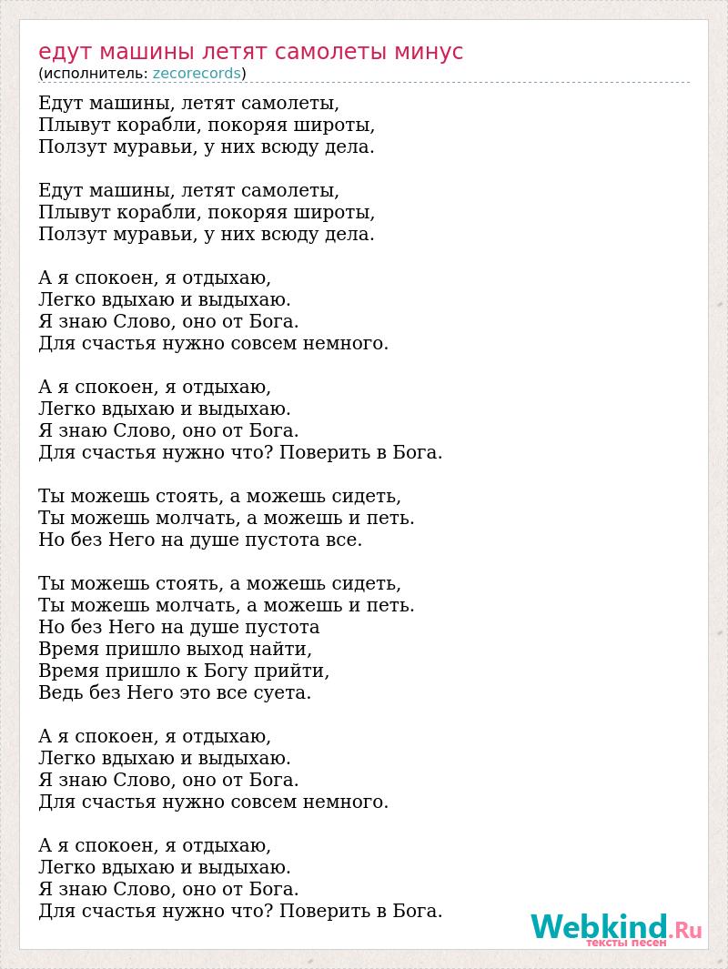 Едут машины, летят самолеты, Плывут корабли, покоряя широты, Ползут муравьи, у них всюду дела. Едут машины, летят самолеты, Плывут корабли, покоряя широты, Ползут муравьи, у них всюду дела. А я спокоен, я отдыхаю, Легко вдыхаю и выдыхаю. Я знаю Слово, оно от Бога. Для счастья нужно совсем немного. А я спокоен, я отдыхаю, Легко вдыхаю и выдыхаю. Я знаю Слово, оно от Бога. Для счастья нужно что? Поверить в Бога. Ты можешь стоять, а можешь сидеть, Ты можешь молчать, а можешь и петь. Но без Него на душе пустота все. Ты можешь стоять, а можешь сидеть, Ты можешь молчать, а можешь и петь. Но без Него на душе пустота Время пришло выход найти, Время пришло к Богу прийти, Ведь без Него это все суета. А я спокоен, я отдыхаю, Легко вдыхаю и выдыхаю. Я знаю Слово, оно от Бога. Для счастья нужно совсем немного. А я спокоен, я отдыхаю, Легко вдыхаю и выдыхаю. Я знаю Слово, оно от Бога. Для счастья нужно что? Поверить в Бога.