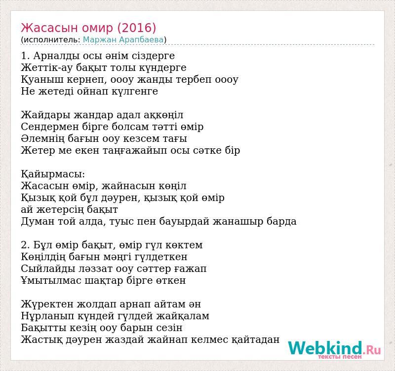 1. Арналды осы әнім сіздерге Жеттік-ау бақыт толы күндерге Қуаныш кернеп, оооу жанды тербеп оооу Не жетеді ойнап күлгенге Жайдары жандар адал ақкөңіл Сендермен бірге болсам тәтті өмір Әлемнің бағын ооу кезсем тағы Жетер ме екен таңғажайып осы сәтке бір Қайырмасы: Жасасын өмір, жайнасын көңіл Қызық қой бұл дәурен, қызық қой өмір ай жетерсің бақыт Думан той алда, туыс пен бауырдай жанашыр барда 2. Бұл өмір бақыт, өмір гүл көктем Көңілдің бағын мәңгі гүлдеткен Сыйлайды ләззат ооу сәттер ғажап Ұмытылмас шақтар бірге өткен Жүректен жолдап арнап айтам ән Нұрланып күндей гүлдей жайқалам Бақытты кезің ооу барын сезін Жастық дәурен жаздай жайнап келмес қайтадан