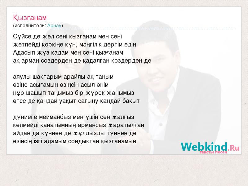 Сүйсе де жел сені қызғанам мен сені жетпейді көркіңе күн, мәңгілік дертім едің Адасып жүз қадам мен сені қызғанам ақ арман сөздерден де қадалған көздерден де аяулы шақтарым арайлы ақ таңым өзіңе асығамын өзіңсін асыл әнім нұр шашып таңымыз бір жүрек жанымыз өтсе де қандай уақыт сағыну қандай бақыт дүниеге мейманбыз мен үшін сен жалғыз келмейді қанатымның армансыз жаратылған айдан да күннен де жұлдызды түннен де өзіңсің ізгі адамым сондықтан қызғанамын