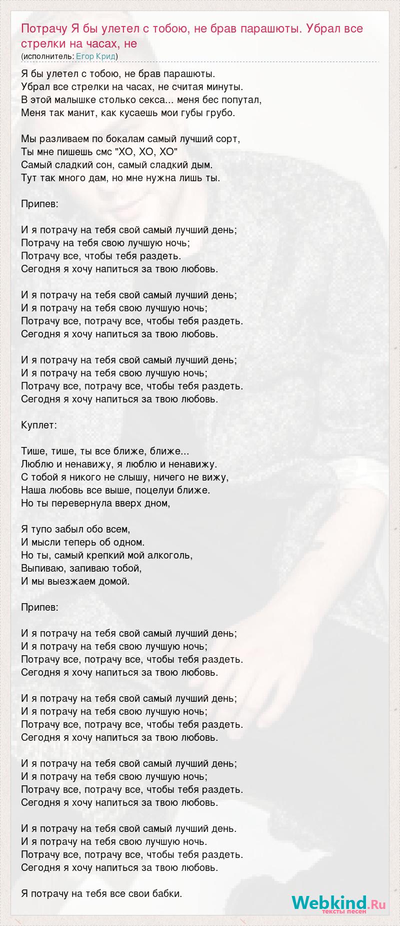 Главная→Исполнители→Егор Крид→Потрачу Я бы улетел с тобою, не брав парашюты. Убрал все стрелки на часах, не