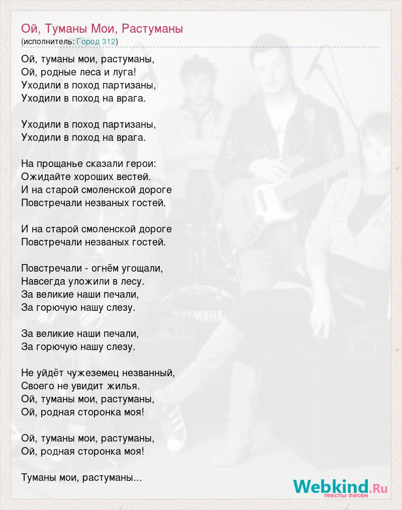 Ой, туманы мои, растуманы, Ой, родные леса и луга! Уходили в поход партизаны, Уходили в поход на врага. Уходили в поход партизаны, Уходили в поход на врага. На прощанье сказали герои: Ожидайте хороших вестей. И на старой смоленской дороге Повстречали незваных гостей. И на старой смоленской дороге Повстречали незваных гостей. Повстречали - огнём угощали, Навсегда уложили в лесу. За великие наши печали, За горючую нашу слезу. За великие наши печали, За горючую нашу слезу. Не уйдёт чужеземец незванный, Своего не увидит жилья. Ой, туманы мои, растуманы, Ой, родная сторонка моя! Ой, туманы мои, растуманы, Ой, родная сторонка моя! Туманы мои, растуманы...