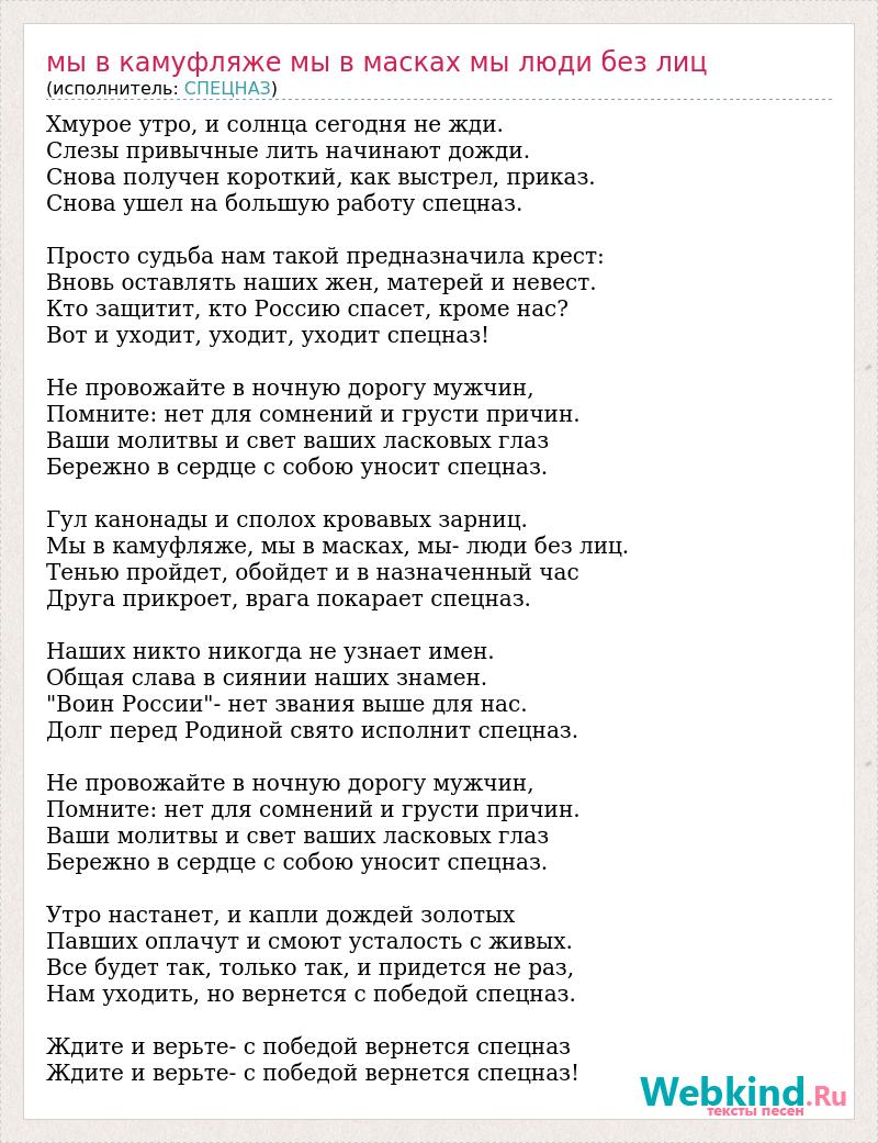Хмурое утро, и солнца сегодня не жди. Слезы привычные лить начинают дожди. Снова получен короткий, как выстрел, приказ. Снова ушел на большую работу спецназ. Просто судьба нам такой предназначила крест: Вновь оставлять наших жен, матерей и невест. Кто защитит, кто Россию спасет, кроме нас? Вот и уходит, уходит, уходит спецназ! Не провожайте в ночную дорогу мужчин, Помните: нет для сомнений и грусти причин. Ваши молитвы и свет ваших ласковых глаз Бережно в сердце с собою уносит спецназ. Гул канонады и сполох кровавых зарниц. Мы в камуфляже, мы в масках, мы- люди без лиц. Тенью пройдет, обойдет и в назначенный час Друга прикроет, врага покарает спецназ. Наших никто никогда не узнает имен. Общая слава в сиянии наших знамен. "Воин России"- нет звания выше для нас. Долг перед Родиной свято исполнит спецназ. Не провожайте в ночную дорогу мужчин, Помните: нет для сомнений и грусти причин. Ваши молитвы и свет ваших ласковых глаз Бережно в сердце с собою уносит спецназ. Утро настанет, и капли дождей золотых Павших оплачут и смоют усталость с живых. Все будет так, только так, и придется не раз, Нам уходить, но вернется с победой спецназ. Ждите и верьте- с победой вернется спецназ Ждите и верьте- с победой вернется спецназ!