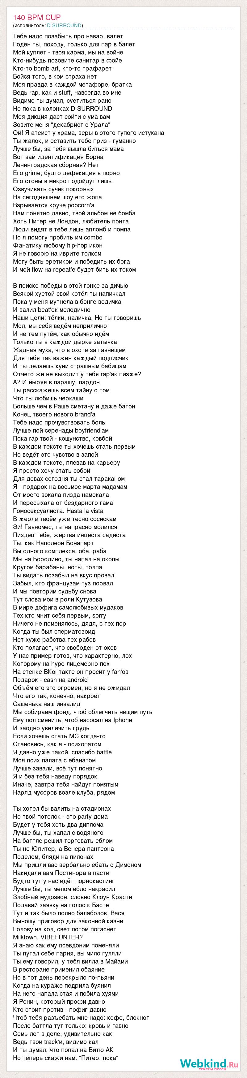 Тебе надо позабыть про навар, валет Годен ты, походу, только для пар в балет Мой куплет - твоя карма, мы на войне Кто-нибудь позовите санитар в фойе Кто-то bomb art, кто-то трафарет Бойся того, в ком страха нет Моя правда в каждой метафоре, братка Ведь rap, как и stuff, навсегда во мне Видимо ты думал, суетиться рано Но пока в колонках D-SURROUND Моя дикция даст сойти с ума вам Зовите меня "декабрист с Урала" Ой! Я атеист у храма, веры в этого тупого истукана Ты жалок, и оставить тебе приз - гуманно Лучше бы, за тебя вышла биться мама Вот вам идентификация Борна Ленинградская сборная? Нет Его grime, будто дефекация в порно Его стоны в микро подойдут лишь Озвучивать сучек покорных На сегодняшнем шоу его жопа Взрывается круче popcorn'а Нам понятно давно, твой альбом не бомба Хоть Питер не Лондон, любитель понта Люди видят в тебе лишь апломб и помпа Но я помогу пробить им combo Фанатику любому hip-hop икон Я не говорю на иврите толком Могу быть еретиком и победить их бога И мой flow на repeat'е будет бить их током В поиске победы в этой гонке за дичью Всякой хуетой свой котёл ты напичкал Пока у меня мутнела в бонге водичка И валил beat'ок мелодично Наши цели: тёлки, наличка. Но ты говоришь Мол, мы себя ведём неприлично И не тем путём, как обычно идём Только ты в каждой дырке затычка Жадная муха, что в охоте за гавнищем Для тебя так важен каждый подписчик И ты делаешь куни страшным бабищам Отчего же не выходит у тебя rap'ак пизже? А? И ныряя в парашу, пардон Ты расскажешь всем тайну о том Что ты любишь черкаши Больше чем в Раше сметану и даже батон Конец твоего нового brand'а Тебе надо прочувствовать боль Лучше пой серенады boyfriend'ам Пока rap твой - кощунство, ковбой В каждом тексте ты хочешь стать первым Но ведёт это чувство в запой В каждом тексте, плевав на карьеру Я просто хочу стать собой Для девах сегодня ты стал тараканом Я - подарок на восьмое марта мадамам От моего вокала пизда намокала И пересыхала от бездарного гама Гомосексуалиста. Hasta la vista В жерле твоём уже тесно сосискам Эй! Гавномес, ты напрасно молился Пиздец тебе, жертва инцеста садиста Ты, как Наполеон Бонапарт Вы одного комплекса, оба, раба Мы на Бородино, ты напал на окопы Кругом барабаны, ноты, толпа Ты видать позабыл на вкус провал Забыл, кто французам туз порвал И мы повторим судьбу снова Тут слова мои в роли Кутузова В мире дофига самолюбивых мудаков Тех кто мнит себя первым, sorry Ничего не поменялось, дядя, с тех пор Когда ты был сперматозоид Нет хуже рабства тех рабов Кто полагает, что свободен от оков У нас пример готов, что характерно, лох Которому на hype лицемерно пох На стенке ВКонтакте он просит у fan'ов Подарок - cash на android Объём его эго огромен, но я не ожидал Что его так, конечно, накроет Сашенька наш инвалид Мы собираем фонд, чтоб облегчить нищим путь Ему пол сменить, чтоб насосал на Iphone И заодно увеличить грудь Если хочешь стать MC когда-то Становись, как я - психопатом Я давно уже такой, спасибо battle Моя псих палата с ебанатом Лучше завали, всё тут понятно Я и без тебя наведу порядок Иначе, завтра тебя найдут помятым Наряд мусоров возле клуба, рядом Ты хотел бы валить на стадионах Но твой потолок - это party дома Будет у тебя хоть два диплома Лучше бы, ты хапал с водяного На баттле решил торговать еблом Ты не Юпитер, а Венера пантеона Поделом, бляди на пилонах Мы пришли вас вербально ебать с Димоном Накидали вам Постинора в пасти Будто тут у 