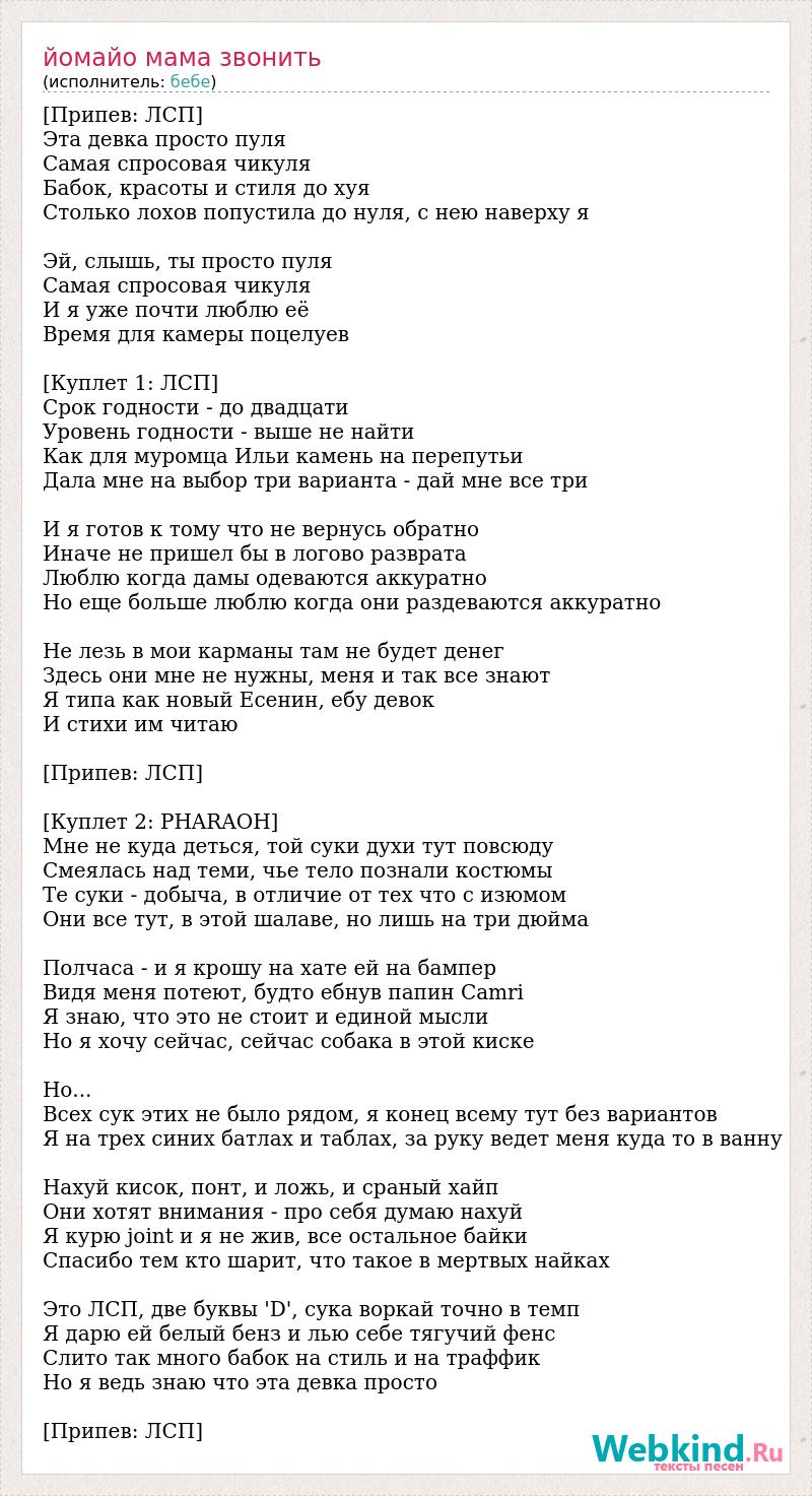 [Припев: ЛСП] Эта девка просто пуля Самая спросовая чикуля Бабок, красоты и стиля до хуя Столько лохов попустила до нуля, с нею наверху я Эй, слышь, ты просто пуля Самая спросовая чикуля И я уже почти люблю её Время для камеры поцелуев [Куплет 1: ЛСП] Срок годности - до двадцати Уровень годности - выше не найти Как для муромца Ильи камень на перепутьи Дала мне на выбор три варианта - дай мне все три И я готов к тому что не вернусь обратно Иначе не пришел бы в логово разврата Люблю когда дамы одеваются аккуратно Но еще больше люблю когда они раздеваются аккуратно Не лезь в мои карманы там не будет денег Здесь они мне не нужны, меня и так все знают Я типа как новый Есенин, ебу девок И стихи им читаю [Припев: ЛСП] [Куплет 2: PHARAOH] Мне не куда деться, той суки духи тут повсюду Смеялась над теми, чье тело познали костюмы Те суки - добыча, в отличие от тех что с изюмом Они все тут, в этой шалаве, но лишь на три дюйма Полчаса - и я крошу на хате ей на бампер Видя меня потеют, будто ебнув папин Camri Я знаю, что это не стоит и единой мысли Но я хочу сейчас, сейчас собака в этой киске Но... Всех сук этих не было рядом, я конец всему тут без вариантов Я на трех синих батлах и таблах, за руку ведет меня куда то в ванну Нахуй кисок, понт, и ложь, и сраный хайп Они хотят внимания - про себя думаю нахуй Я курю joint и я не жив, все остальное байки Спасибо тем кто шарит, что такое в мертвых найках Это ЛСП, две буквы 'D', сука воркай точно в темп Я дарю ей белый бенз и лью себе тягучий фенс Слито так много бабок на стиль и на траффик Но я ведь знаю что эта девка просто [Припев: ЛСП]