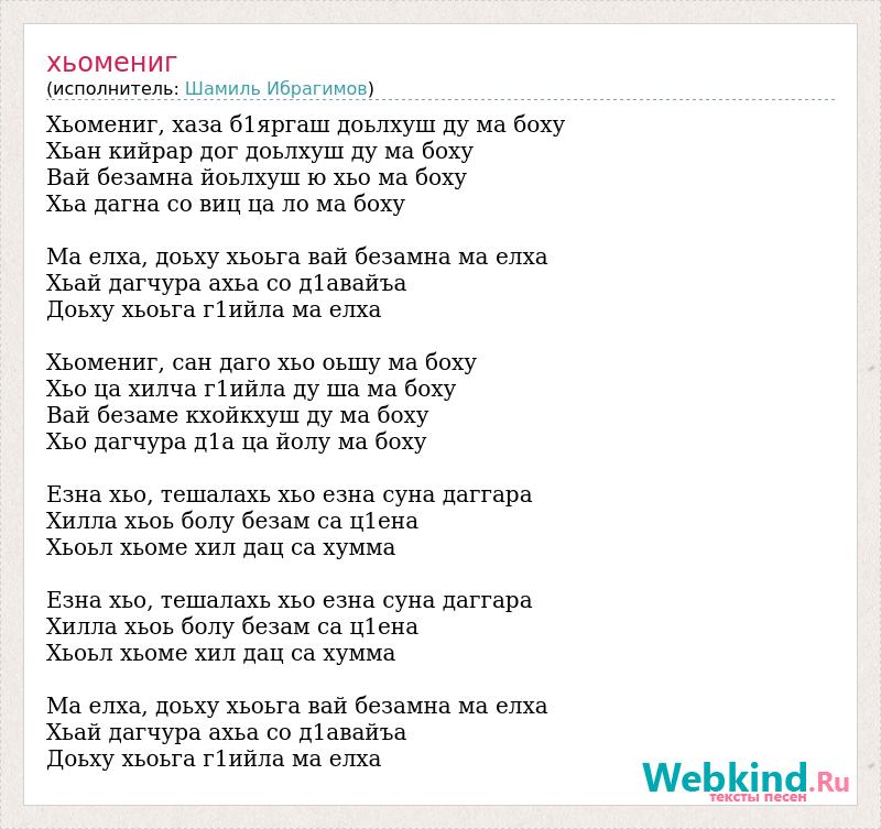 Хьомениг, хаза б1яргаш доьлхуш ду ма боху Хьан кийрар дог доьлхуш ду ма боху Вай безамна йоьлхуш ю хьо ма боху Хьа дагна со виц ца ло ма боху Ма елха, доьху хьоьга вай безамна ма елха Хьай дагчура ахьа со д1авайъа Доьху хьоьга г1ийла ма елха Хьомениг, сан даго хьо оьшу ма боху Хьо ца хилча г1ийла ду ша ма боху Вай безаме кхойкхуш ду ма боху Хьо дагчура д1а ца йолу ма боху Езна хьо, тешалахь хьо езна суна даггара Хилла хьоь болу безам са ц1ена Хьоьл хьоме хил дац са хумма Езна хьо, тешалахь хьо езна суна даггара Хилла хьоь болу безам са ц1ена Хьоьл хьоме хил дац са хумма Ма елха, доьху хьоьга вай безамна ма елха Хьай дагчура ахьа со д1авайъа Доьху хьоьга г1ийла ма елха