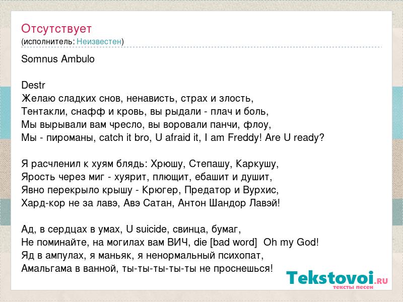 Somnus Ambulo Destr Желаю сладких снов, ненависть, страх и злость, Тентакли, снафф и кровь, вы рыдали - плач и боль, Мы вырывали вам чресло, вы воровали панчи, флоу, Мы - пироманы, catch it bro, U afraid it, I am Freddy! Are U ready? Я расчленил к хуям блядь: Хрюшу, Степашу, Каркушу, Ярость через миг - хуярит, плющит, ебашит и душит, Явно перекрыло крышу - Крюгер, Предатор и Вурхис, Хард-кор не за лавэ, Авэ Сатан, Антон Шандор Лавэй! Ад, в сердцах в умах, U suicide, свинца, бумаг, Не поминайте, на могилах вам ВИЧ, die [bad word] Oh my God! Яд в ампулах, я маньяк, я ненормальный психопат, Амальгама в ванной, ты-ты-ты-ты-ты не проснешься!