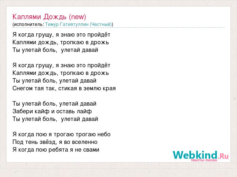 Я когда грущу, я знаю это пройдёт Каплями дождь, тропкаю в дрожь Ты улетай боль, улетай давай Я когда грущу, я знаю это пройдёт Каплями дождь, тропкаю в дрожь Ты улетай боль, улетай давай Снегом тая так, стикая в землю края Ты улетай боль, улетай давай Забери кайф и оставь лайф Ты улетай боль, улетай давай Я когда пою я трогаю трогаю небо Под тень звёзд, я во вселенно Я когда пою ребята я не свами