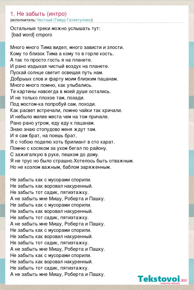Остальные треки можно услышать тут: [bad word] cmporo Много много Тима видел, много зависти и злости. Кому то близок Тима а кому то в горле кость. А так то просто гость я на планете. И рано издыхая чистый воздух на планете. Пускай солнце светит освещая путь нам. Добрыых слов и фарту моим близким пацанам. Много много помню, как улыбались. Те картины навсегда в моей душе остались. И не только плохое там, позади. Под мостом-ка попробуй сам, походи. Как расвет встречали, помню чайки так кричали. И небыло милее места чем на том причале. Рано рано утром, еду еду к пацанам. Знаю знаю стопудово меня ждут там. И я сам брат, на поешь брат. Я с тобою поделю хоть брилиант в сто карат. Помню с косяком за ухом бегал по району. С зажигалкую в руке, пешком до дому. Я не трус но было страшно.Хотелось быть отважным. Но не козлом важным, баблом заряженным. Не забыть как с мусорами спорили. Не забыть как воровал накуренный. Не забыть тот садик, пятиэтажку. А не забыть мне Мишу, Роберта и Пашку. Не забыть как с мусорами спорили. Не забыть как воровал накуренный. Не забыть тот садик, пятиэтажку. А не забыть мне Мишу, Роберта и Пашку. Не забыть как с мусорами спорили. Не забыть как воровал накуренный. Не забыть тот садик, пятиэтажку. А не забыть мне Мишу, Роберта и Пашку. Не забыть как с мусорами спорили. Не забыть как воровал накуренный. Не забыть тот садик, пятиэтажку. А не забыть мне Мишу, Роберта и Пашку.