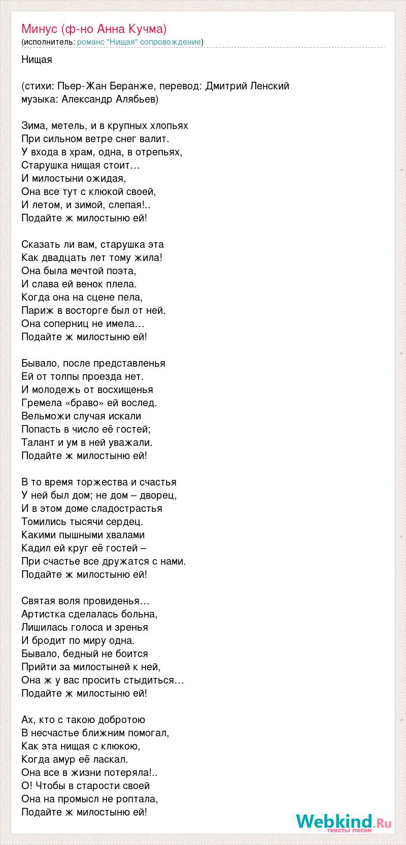 Нищая (стихи: Пьер-Жан Беранже, перевод: Дмитрий Ленский музыка: Александр Алябьев) Зима, метель, и в крупных хлопьях При сильном ветре снег валит. У входа в храм, одна, в отрепьях, Старушка нищая стоит… И милостыни ожидая, Она все тут с клюкой своей, И летом, и зимой, слепая!.. Подайте ж милостыню ей! Сказать ли вам, старушка эта Как двадцать лет тому жила! Она была мечтой поэта, И слава ей венок плела. Когда она на сцене пела, Париж в восторге был от ней. Она соперниц не имела… Подайте ж милостыню ей! Бывало, после представленья Ей от толпы проезда нет. И молодежь от восхищенья Гремела «браво» ей вослед. Вельможи случая искали Попасть в число её гостей; Талант и ум в ней уважали. Подайте ж милостыню ей! В то время торжества и счастья У ней был дом; не дом – дворец, И в этом доме сладострастья Томились тысячи сердец. Какими пышными хвалами Кадил ей круг её гостей – При счастье все дружатся с нами. Подайте ж милостыню ей! Святая воля провиденья… Артистка сделалась больна, Лишилась голоса и зренья И бродит по миру одна. Бывало, бедный не боится Прийти за милостыней к ней, Она ж у вас просить стыдиться… Подайте ж милостыню ей! Ах, кто с такою добротою В несчастье ближним помогал, Как эта нищая с клюкою, Когда амур её ласкал. Она все в жизни потеряла!.. О! Чтобы в старости своей Она на промысл не роптала, Подайте ж милостыню ей!