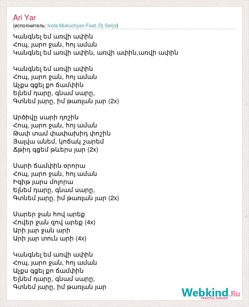 Կանգնել եմ առվի ափին Հոպ, յարո ջան, հոյ աման Կանգնել եմ առվի ափին, առվի ափին,առվի ափին Կանգնել եմ առվի ափին Հոպ, յարո ջան, հոյ աման Աչքս գցել քո ճամփին Ելնեմ դարը, գնամ սարը, Գտնեմ յարը, իմ թառլան յար (2x) Արծիվը սարի դոշին Հոպ, յարո ջան, հոյ աման Թափ տամ փափախիդ փոշին Յալվա անեմ, կոճակ շարեմ Ճթիդ գցեմ թևերս յար (2x) Սարի ճամփին օրորա Հոպ, յարո ջան, հոյ աման Իգիթ յարս մոլորա Ելնեմ դարը, գնամ սարը, Գտնեմ յարը, իմ թառլան յար (2x) Սարեր ջան հով արեք Հովեր ջան զով արեք (4x) Արի յար ջան արի Արի յար տուն արի (4x) Կանգնել եմ առվի ափին Հոպ, յարո ջան, հոյ աման Աչքս գցել քո ճամփին Ելնեմ դարը, գնամ սարը, Գտնեմ յարը, իմ թառլան յար