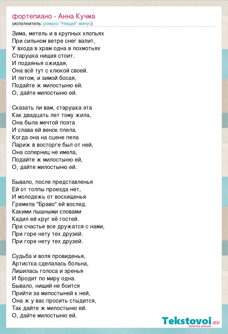 Зима, метель и в крупных хлопьях При сильном ветре снег валит, У входа в храм одна в лохмотьях Старушка нищая стоит. И подаянья ожидая, Она всё тут с клюкой своей. И летом, и зимой босая, Подайте ж милостыню ей. О, дайте милостыню ей. Сказать ли вам, старушка эта Как двадцать лет тому жила, Она была мечтой поэта И слава ей венок плела. Когда она на сцене пела Париж в восторге был от ней, Она соперниц не имела, Подайте ж милостыню ей, О, дайте милостыню ей. Бывало, после представленья Ей от толпы проезда нет, И молодежь от восхищенья Гремела "Браво" ей вослед. Какими пышными словами Кадил ей круг её гостей. При счастье все дружатся с нами, При горе нету тех друзей. При горе нету тех друзей. Судьба и воля провиденья, Артистка сделалась больна, Лишилась голоса и зренья И бродит по миру одна. Бывало, нищий не боится Прийти за милостыней к ней, Она ж у вас просить стыдится, Так дайте ж милостыню ей. О, дайте милостыню ей.