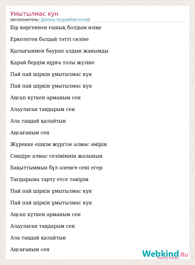 Бір көргеннен ғашық болдым өзіңе Еркелеген балдай тәтті сөзіне Қылығынмен баурап алдын жанымды Қарай бердім нұрға толы жүзіне Пай пай шіркін ұмытылмас күн Пай пай шіркін ұмытылмас күн Аңсап күткен арманым сен Алаулаған таңдарым сен Ала таңдай қалайтын Аңсағаным сен Жүрекке ешкім жүргізе алмас әмірін Сөндіре алмас сезімімнін жалынын Бақыттыммын бұл әлемге сені егер Тағдырыма тарту етсе тәнірім Пай пай шіркін ұмытылмас күн Пай пай шіркін ұмытылмас күн Аңсап күткен арманым сен Алаулаған таңдарым сен Ала таңдай қалайтын Аңсағаным сен