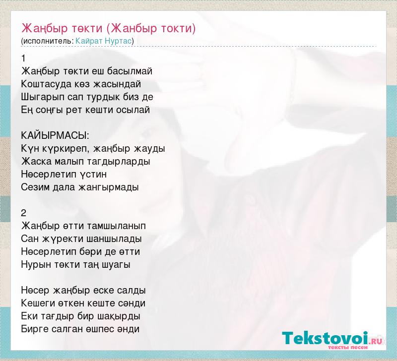 1 Жаңбыр төкти еш басылмай Коштасуда көз жасындай Шыгарып сап турдык биз де Ең соңғы рет кешти осылай КАЙЫРМАСЫ: Күн күркиреп, жаңбыр жауды Жаска малып тагдырларды Нөсерлетип үстин Сезим дала жангырмады 2 Жаңбыр өтти тамшыланып Сан жүректи шаншылады Нөсерлетип бәри де өтти Нурын төкти таң шуагы Нөсер жаңбыр еске салды Кешеги өткен кеште сәнди Еки тағдыр бир шақырды Бирге салган өшпес әнди