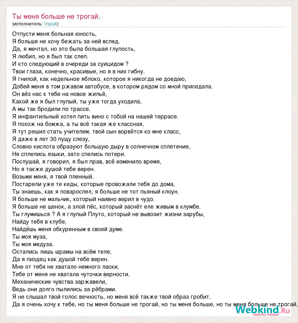 Отпусти меня больная юность, Я больше не хочу бежать за ней вслед. Да, я мечтал, но это была большая глупость, Я любил, но я был так слеп. И кто следующий в очереди за суицидом ? Твои глаза, конечно, красивые, но я в них гибну. Я гнилой, как недельное яблоко, которое я никогда не доедаю, Добей меня в том ржавом автобусе, в котором рядом со мной приседала. Он вёз нас к тебе на новое жильё, Какой же я был глупый, ты уже тогда уходила, А мы так бродили по трассе. Я инфантильный хотел пить вино с тобой на нашей террасе. Я похож на бомжа, а ты всё такая же классная, Я тут решил стать учителем, твой сын ворвётся ко мне класс, Я даже в лет 30 пущу слезу, Словно кислота образуют большую дыру в солнечном сплетение, Не сплелись языки, зато спелись потери. Послушай, я говорил, я был прав, всё изменило время, Но я также душой тебе верен. Возьми меня, я твой пленный. Постарели уже те кеды, которые провожали тебя до дома, Ты знаешь, как я повзрослел, я больше не тот пьяный клоун. Я больше не мальчик, который наивно верил в чудо. Я больше не щенок, а злой пёс, который заснёт еле живым в клумбе. Ты глумишься ? А я глупый Плуто, который не вывозит жизни зарубы, Найду тебя в клубе, Найдёшь меня обкуренным в своей думе. Ты моя муза, Ты моя медуза. Остались лишь шрамы на всём теле, Да я пиздец как душой тебе верен. Мне от тебя не хватало немного ласки, Тебе от меня не хватала чуточки верности. Механические чувства заржавели, Ведь они долго пылились за рёбрами. Я не слышал твой голос вечность, но меня всё также твой образ гробит. Да я очень хочу к тебе, но ты меня больше не трогай, но ты меня больше, но ты меня больше не трогай.