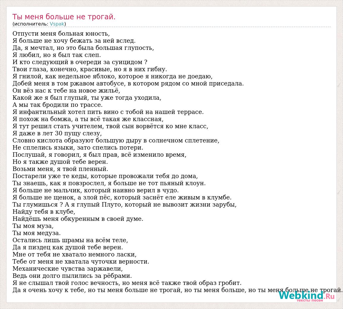 Отпусти меня больная юность, Я больше не хочу бежать за ней вслед. Да, я мечтал, но это была большая глупость, Я любил, но я был так слеп. И кто следующий в очереди за суицидом ? Твои глаза, конечно, красивые, но я в них гибну. Я гнилой, как недельное яблоко, которое я никогда не доедаю, Добей меня в том ржавом автобусе, в котором рядом со мной приседала. Он вёз нас к тебе на новое жильё, Какой же я был глупый, ты уже тогда уходила, А мы так бродили по трассе. Я инфантильный хотел пить вино с тобой на нашей террасе. Я похож на бомжа, а ты всё такая же классная, Я тут решил стать учителем, твой сын ворвётся ко мне класс, Я даже в лет 30 пущу слезу, Словно кислота образуют большую дыру в солнечном сплетение, Не сплелись языки, зато спелись потери. Послушай, я говорил, я был прав, всё изменило время, Но я также душой тебе верен. Возьми меня, я твой пленный. Постарели уже те кеды, которые провожали тебя до дома, Ты знаешь, как я повзрослел, я больше не тот пьяный клоун. Я больше не мальчик, который наивно верил в чудо. Я больше не щенок, а злой пёс, который заснёт еле живым в клумбе. Ты глумишься ? А я глупый Плуто, который не вывозит жизни зарубы, Найду тебя в клубе, Найдёшь меня обкуренным в своей думе. Ты моя муза, Ты моя медуза. Остались лишь шрамы на всём теле, Да я пиздец как душой тебе верен. Мне от тебя не хватало немного ласки, Тебе от меня не хватала чуточки верности. Механические чувства заржавели, Ведь они долго пылились за рёбрами. Я не слышал твой голос вечность, но меня всё также твой образ гробит. Да я очень хочу к тебе, но ты меня больше не трогай, но ты меня больше, но ты меня больше не трогай.