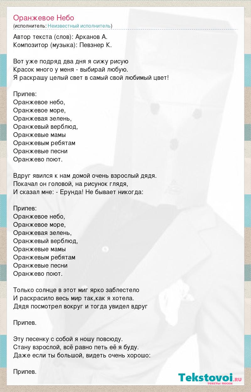 Автор текста (слов): Арканов А. Композитор (музыка): Певзнер К. Вот уже подряд два дня я сижу рисую Красок много у меня - выбирай любую. Я раскрашу целый свет в самый свой любимый цвет! Припев: Оранжевое небо, Оранжевое море, Оранжевая зелень, Оранжевый верблюд, Оранжевые мамы Оранжевым ребятам Оранжевые песни Оранжево поют. Вдруг явился к нам домой очень взрослый дядя. Покачал он головой, на рисунок глядя, И сказал мне: - Ерунда! Не бывает никогда: Припев: Оранжевое небо, Оранжевое море, Оранжевая зелень, Оранжевый верблюд, Оранжевые мамы Оранжевым ребятам Оранжевые песни Оранжево поют. Только солнце в этот миг ярко заблестело И раскрасило весь мир так,как я хотела. Дядя посмотрел вокруг и тогда увидел вдруг Припев. Эту песенку с собой я ношу повсюду. Стану взрослой, всё равно петь её я буду. Даже если ты большой, видеть очень хорошо: Припев.