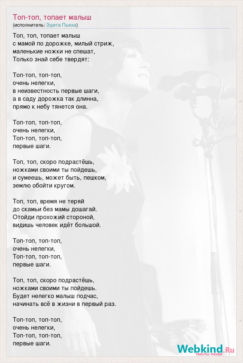 Топ, топ, топает малыш с мамой по дорожке, милый стриж, маленькие ножки не спешат, Только знай себе твердят: Топ-топ, топ-топ, очень нелегки, в неизвестность первые шаги, а в саду дорожка так длинна, прямо к небу тянется она. Топ-топ, топ-топ, очень нелегки, Топ-топ, топ-топ, первые шаги. Топ, топ, скоро подрастёшь, ножками своими ты пойдешь, и сумеешь, может быть, пешком, землю обойти кругом. Топ, топ, время не теряй до скамьи без мамы дошагай. Отойди прохожий стороной, видишь человек идёт большой. Топ-топ, топ-топ, очень нелегки, Топ-топ, топ-топ, первые шаги. Топ, топ, скоро подрастёшь, ножками своими ты пойдешь. Будет нелегко малыш подчас, начинать всё в жизни в первый раз. Топ-топ, топ-топ, очень нелегки, Топ-топ, топ-топ, первые шаги.