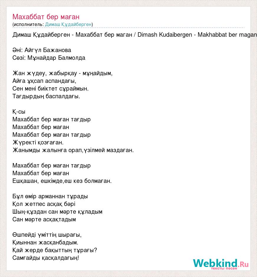 Димаш Құдайберген - Махаббат бер маган / Dimash Kudaibergen - Makhabbat ber magan Әні: Айгүл Бажанова Сөзі: Мұнайдар Балмолда Жан жүдеу, жабырқау - мұңайдым, Айға ұқсап аспандағы, Сен мені биіктет сұраймын. Тағдырдың баспалдағы. Қ-сы Махаббат бер маған тағдыр Махаббат бер маған Махаббат бер маған тағдыр Жүректі қозғаған. Жанымды жалынға орап,үзілмей маздаған. Махаббат бер маған тағдыр Махаббат бер маған Ешқашан, ешкімде,еш кез болмаған. Бұл өмір арманнан тұрады Қол жетпес асқақ бәрі Шың-құздан сан мәрте құладым Сан мәрте асқақтадым Өшпейді үміттің шырағы, Қиыннан жасқанбадым. Қай жерде бақыттың тұрағы? Самғайды қасқалдағың!